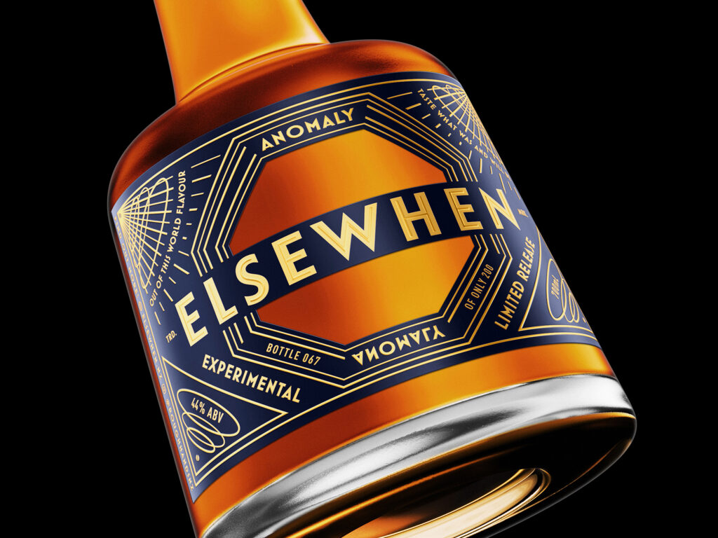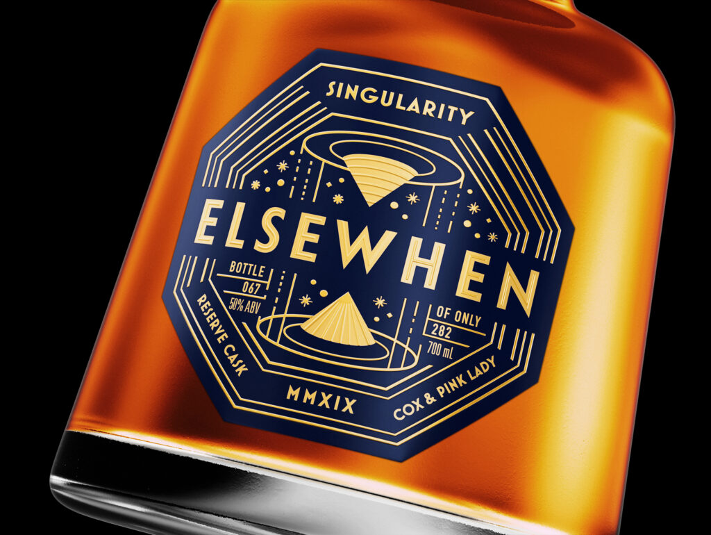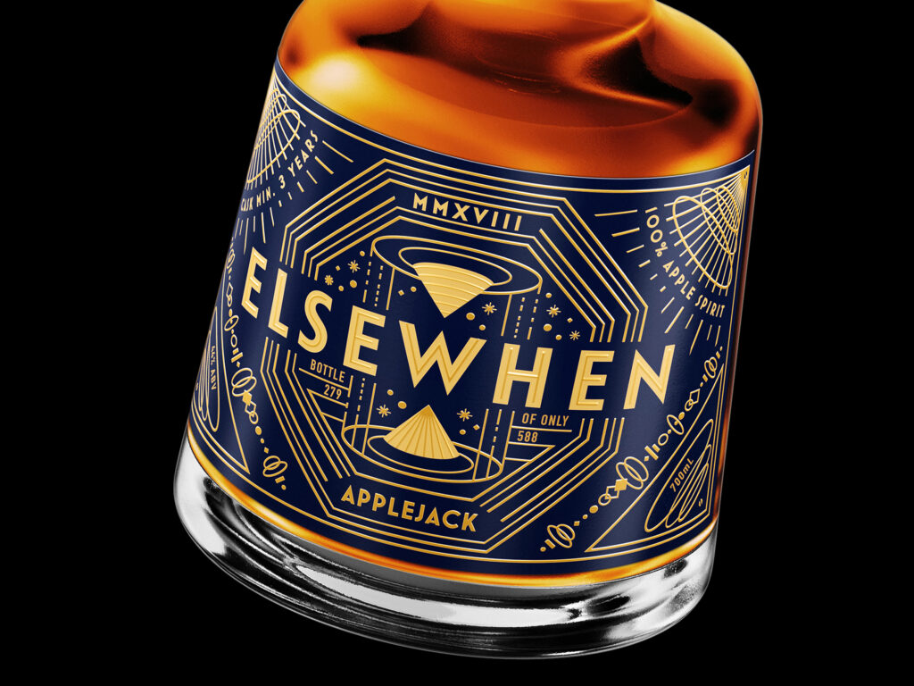 With a brief codenamed “Cocktails To Mars”; themes of time travel; wormholes, mythical space “alconauts”, and apples first cultivated in 1830… Elsewhen Apple Jack brandy was always destined to have an eclectic brand identity. Our design thinking had to incorporate these fresh and playful ideas, yet retain a premium feel in keeping with the limited edition product.