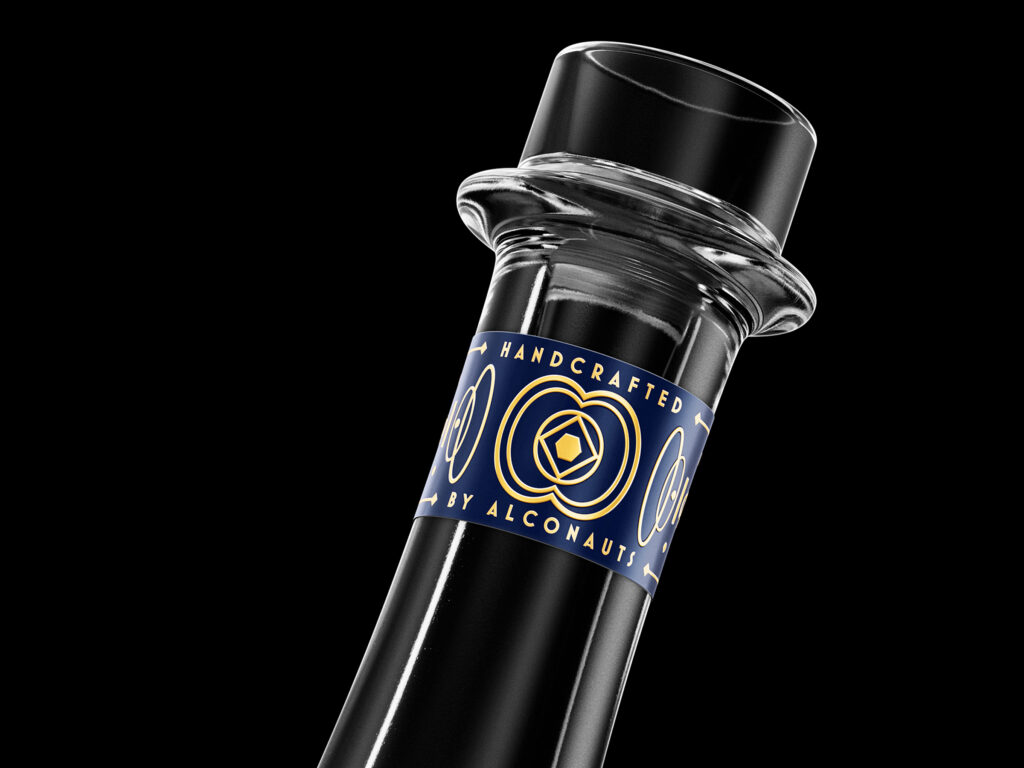 The label design embraced fantastical concepts of outer space, based on a celestial chart and teleportation with deco style lettering to project a blend of craft and intellect. The label finish is a testament to the challenges of creating beautifully embellished labels in short digital runs. We trialled multiple substrates and finishes before deciding on a metalized stock for its engineering qualities and ability to achieve a distinctive emboss which doesn’t flatten out when applied to the bottle and it enabled us to deliver a cost-effective foil look with unique bottle numbers and vintages.