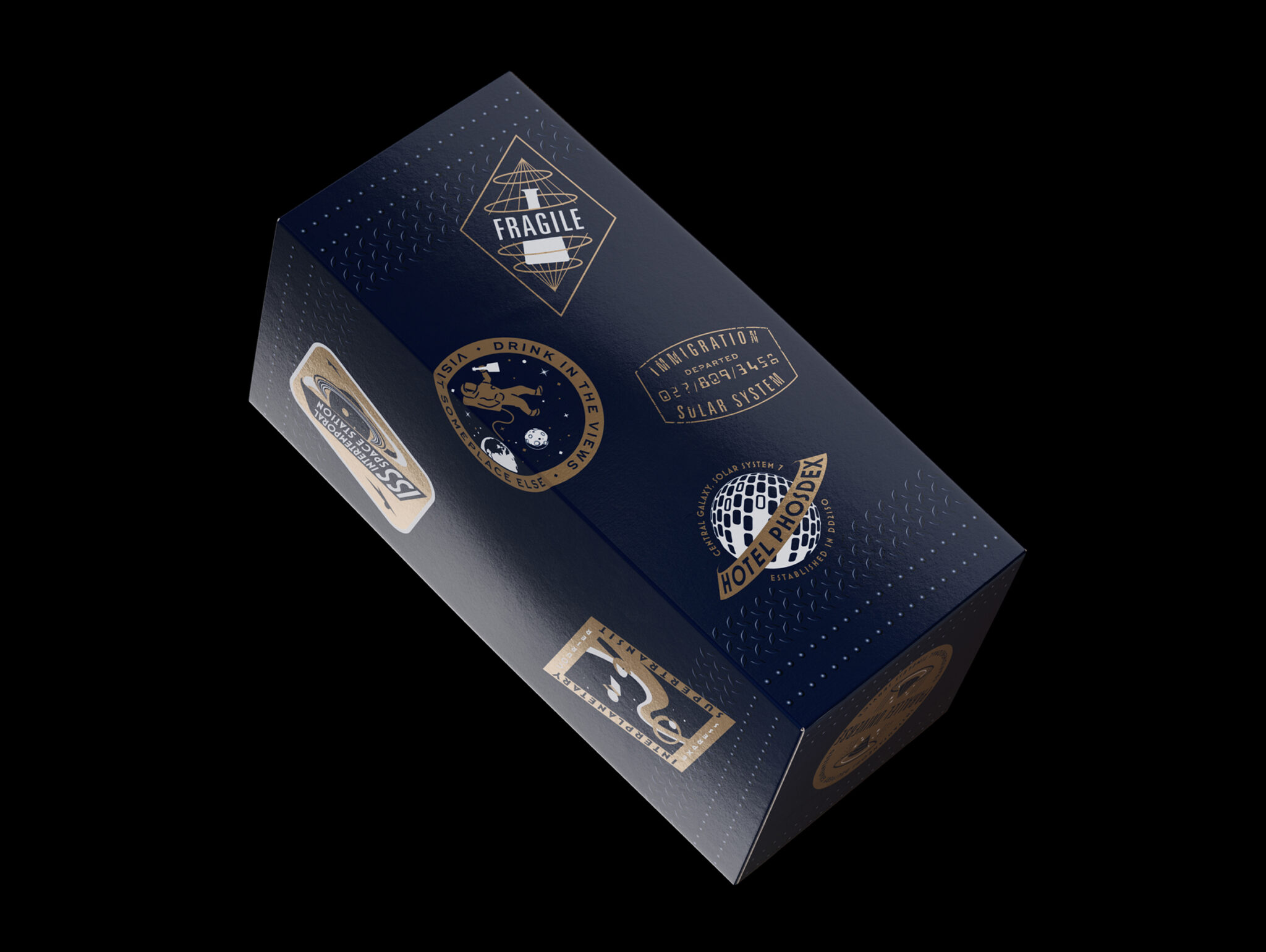 A custom shipping box was a natural extension to the “Cocktails To Mars” theme. The brief was an intergalactic transport device for our mythical “alconauts” to carry precious cargo across time and space. The dual function of the bespoke box elevates the brand experience while removing the need for extra packaging for shipping. To fully embrace the intergalactic theme, we created imaginary passport and visa inspired travel stamps to cement Elsewhen as a brand deserving of its own parallel universe.