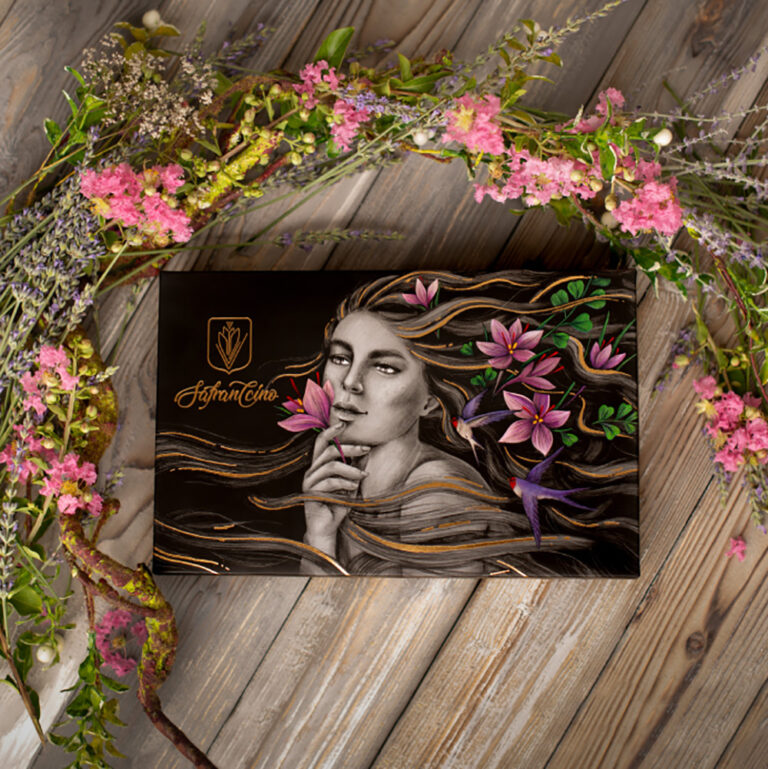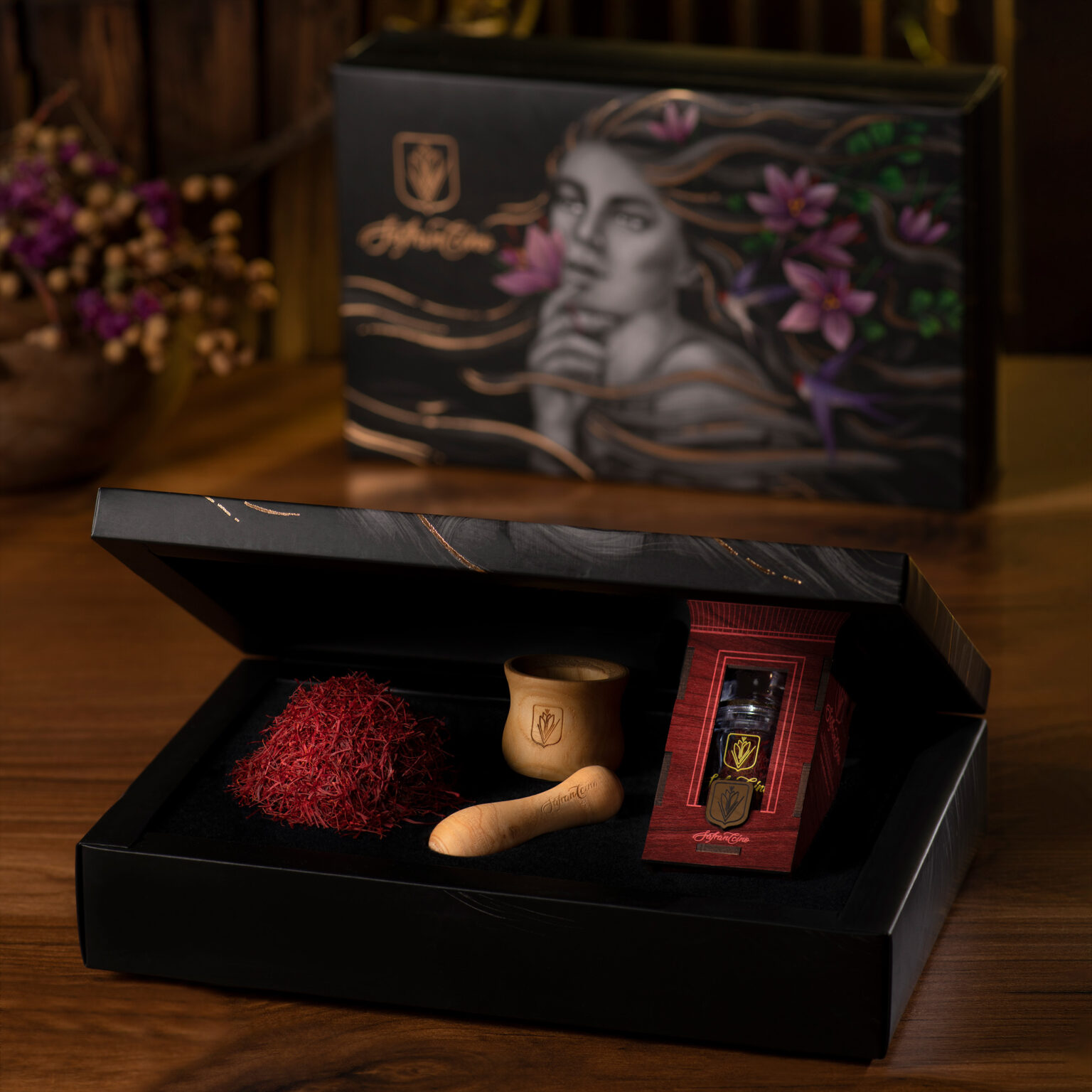 Considering the value of the saffron products and the importance of the culture of gifting, Irfan designers have designed this saffron gift box packaging in such a way that in addition to the beauty of the appearance, it also fully protects the products inside the box. The combination of the gilding effect on the black and white pattern of this packaging has multiplied its effect and at the same time, the purple flowers that are placed in this girl’s hair are reminiscent of the saffron product.