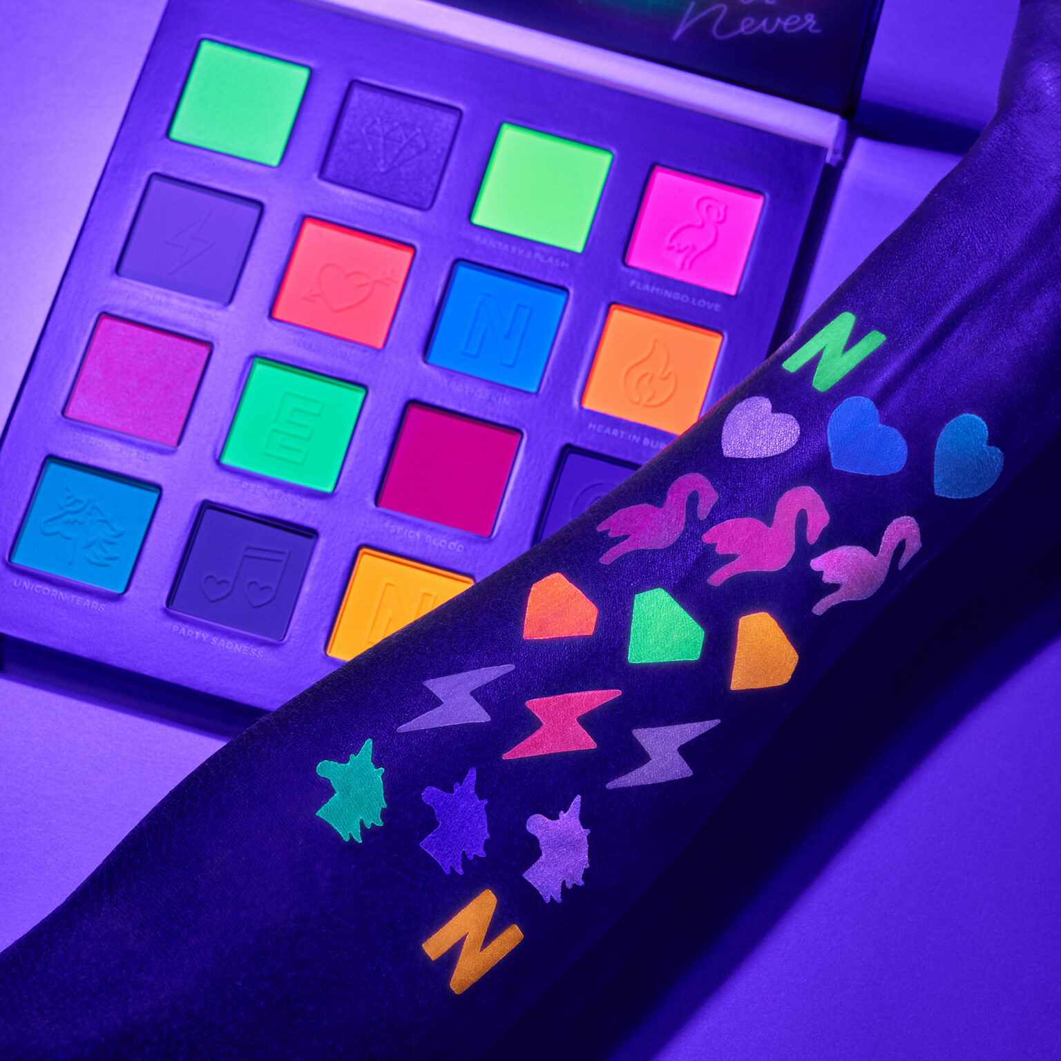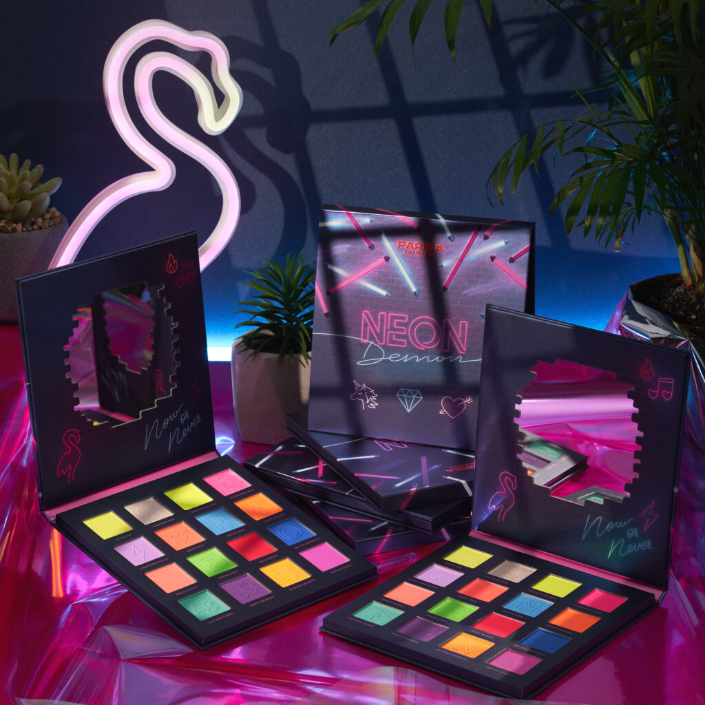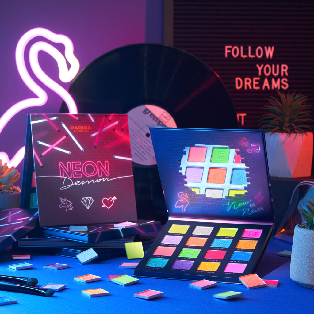 Limited neon eyeshadow palette Neon Demon. Attractive lights of the night city inspire to unforgettable festival of color that add brightness to any look.12 mesmerizing matte and 4 weightless satin shades to create a unique and exciting make-up.
