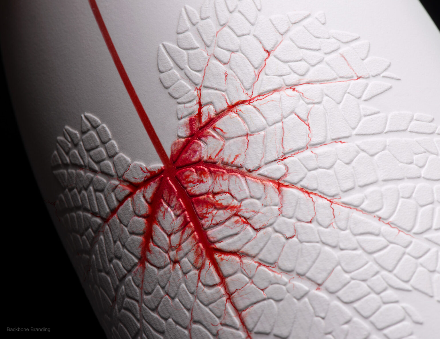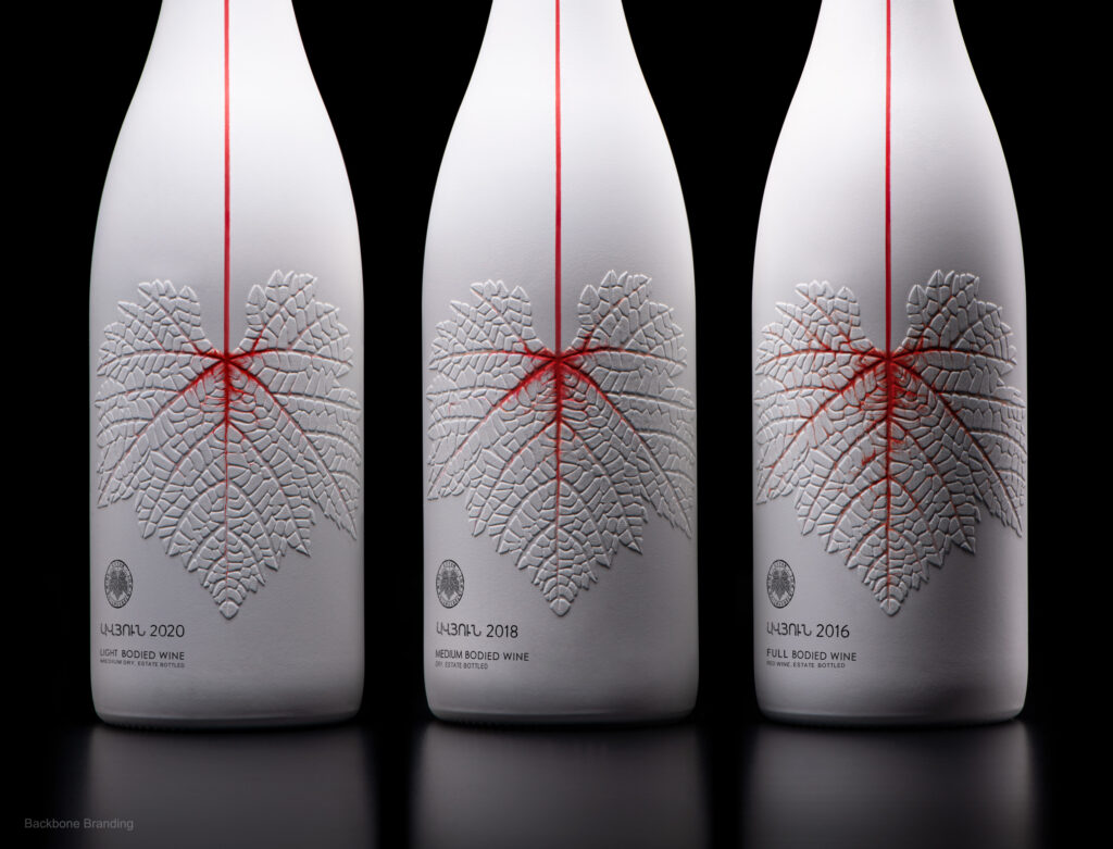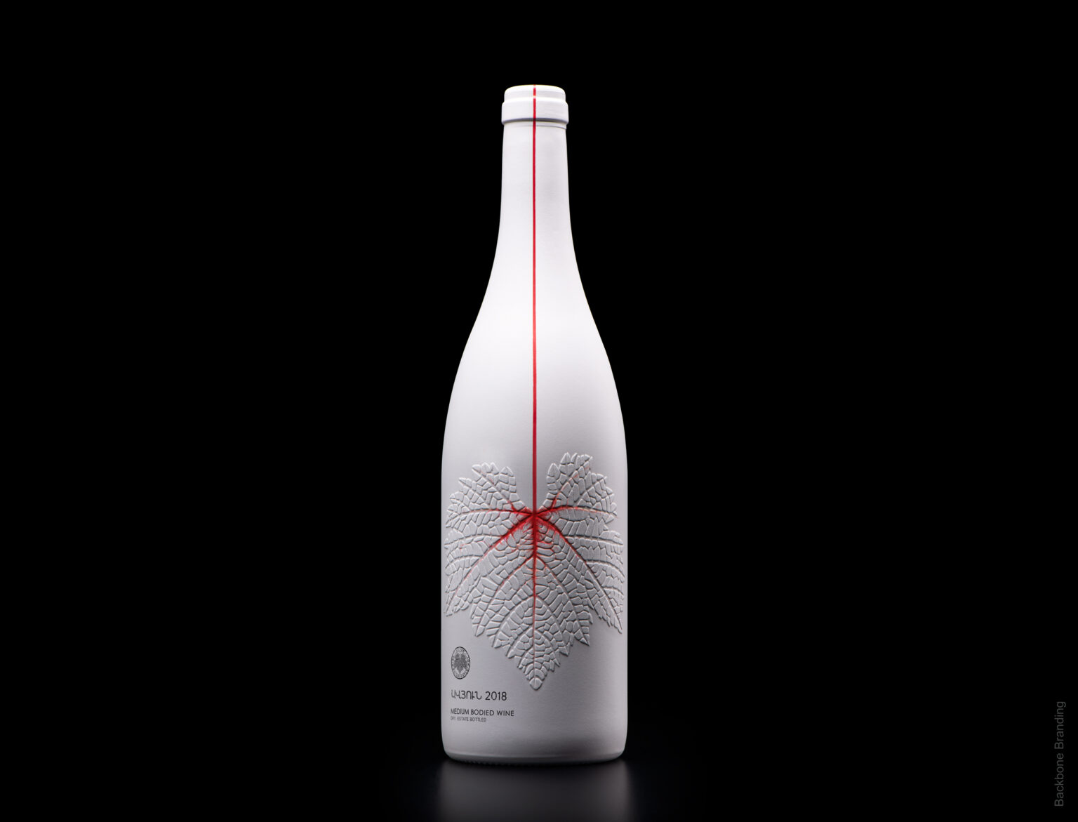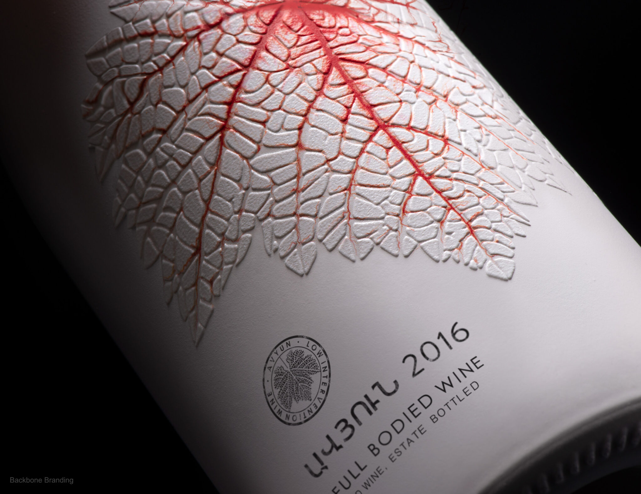 This metamorphosis of grapes into wine inspired us to create a design which is minimalistic, yet bold and lucid. The central element is an embossed grape leaf and through it we exhibit the storyline of the grapes moving down, permeating into the vessel of wine. The distinct vigor and energy of the grape, flowing through the veins of the leaf and turning them red, parallels with the blood that flows through our veins.