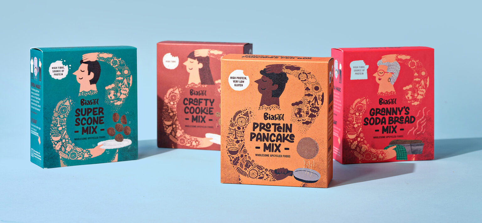 Packaging for ready-made cookies, scones, pancakes and soda bread which used upcycled spent brewers grain as a core ingredient. The brand proposition is “Good for your mind and Good for your body”, therefore one arm leading to the head features environmental icons and the arm leading to the stomach features nutritional icons.