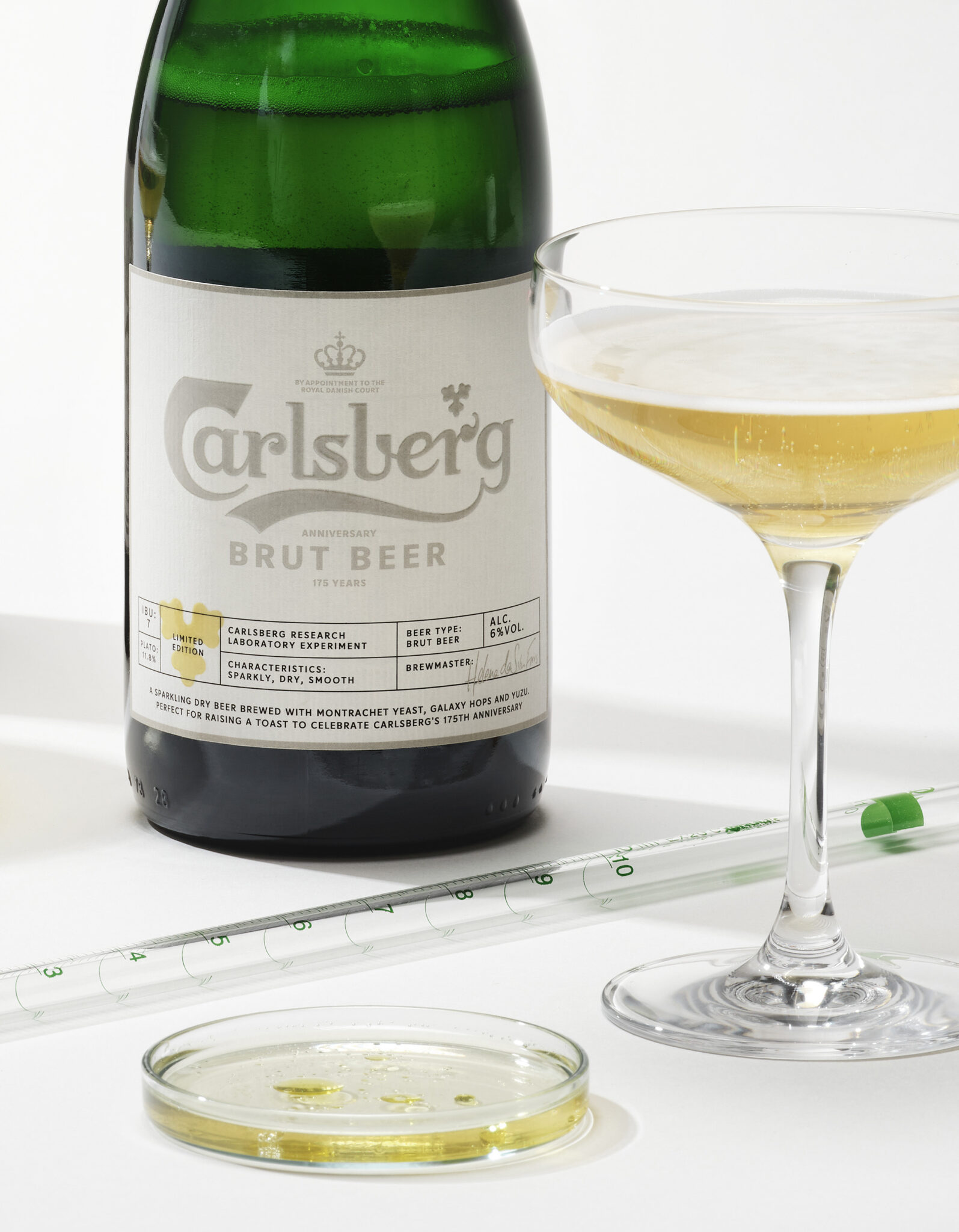 The sparkly, dry, smooth Brut Beer is brewed with passion and is a fitting homage to all the skilled brewmasters. At the Carlsberg Research Laboratory, they tirelessly explore the taste possibilities in beer. Inspired by their laboratory, Scandinavian consumer brand agency Everland designed a fitting label for this special beer.