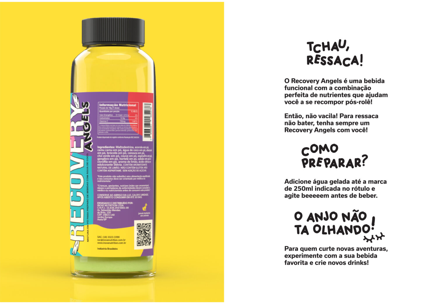Recovery Angels é a evolução de um produto já existente da Inove Nutrition®. O objetivo original desse produto era o de recuperar e hidratar o corpo pós-treino, mas ele não se limita apenas a quem pratica atividade física com frequência, ele também recupera e hidrata pessoas com ressaca. Percebendo esse novo nicho, a empresa optou por repaginar o rótulo e apresentá-lo em uma nova embalagem.