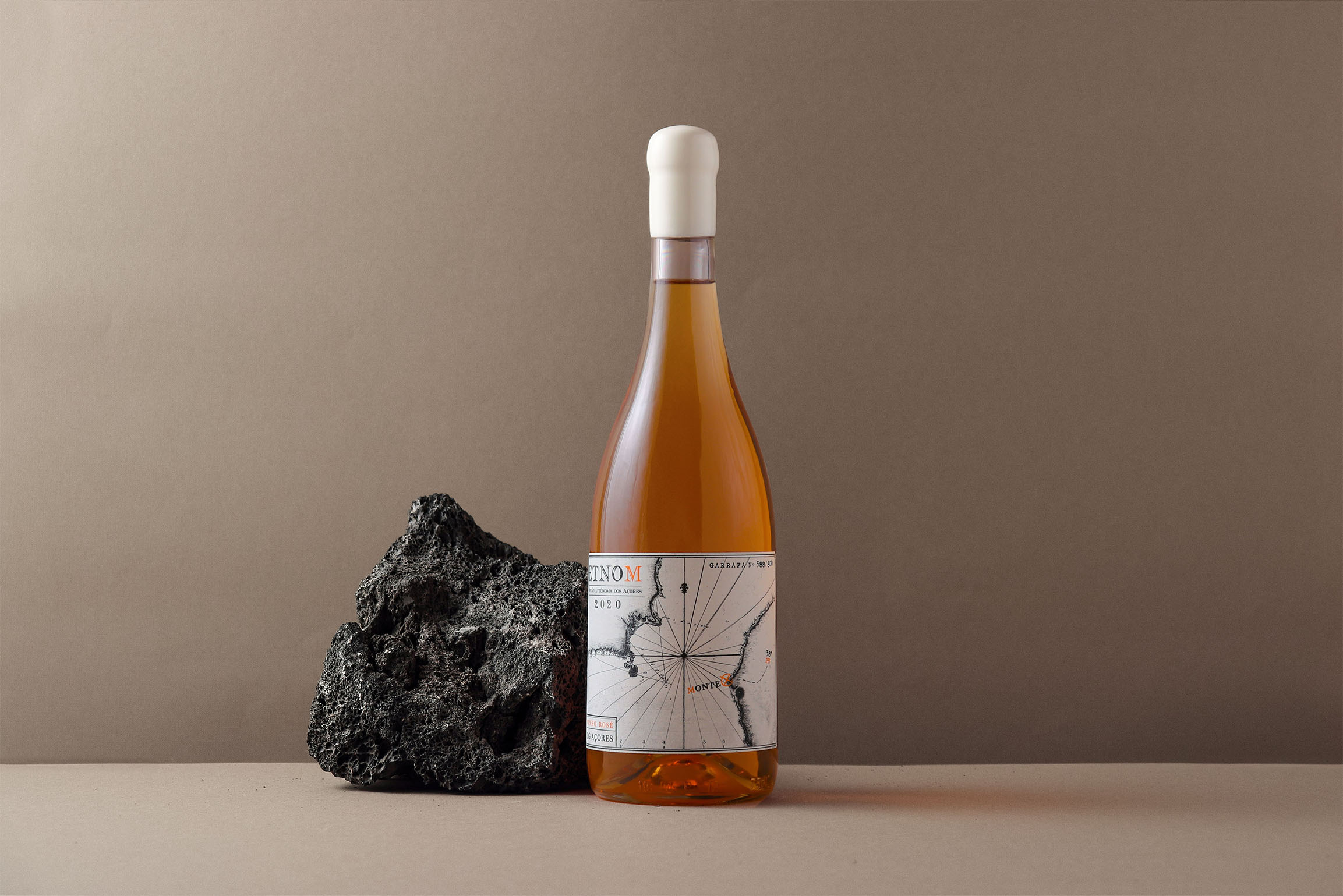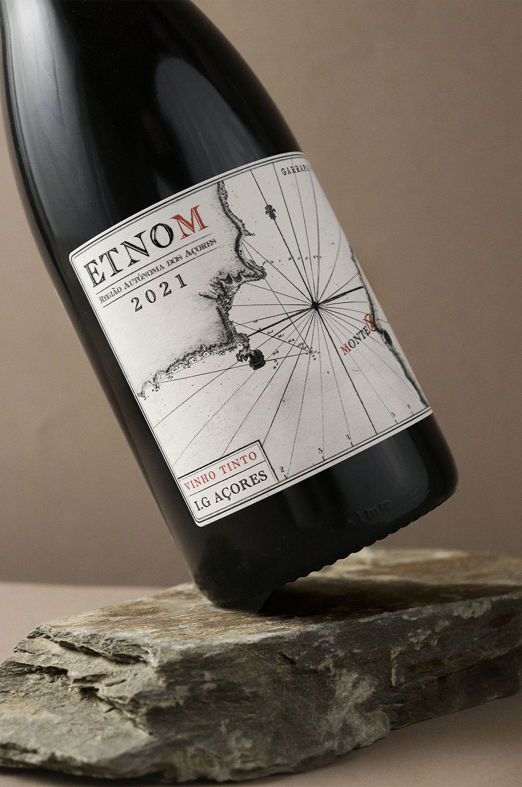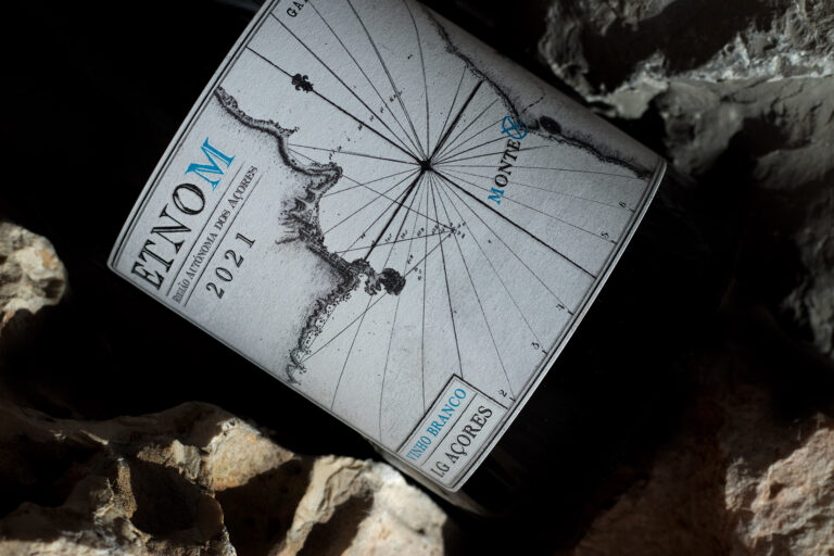 ETNOM written backwards means MONTE, where the ‘Laranjos’ family have been making wine for several centuries. We used an old map of the islands of Pico and Faial as a sketch for this label, which contains a map that challenges anyone who wants to discover the treasure of the local vineyards.