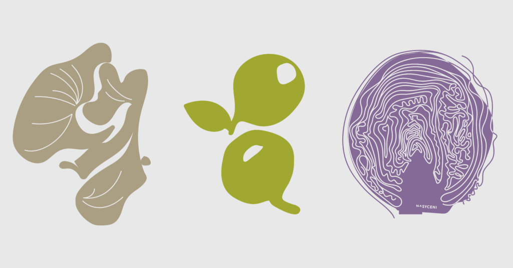 Nasyceni is celebrating everything that happens in the kitchen and shows it in rich and inspiring ways. The focus of the illustrations are the different ingredients, their inspiring shapes and juicy colours. For the textile design I chose oyster mushrooms, green olives, both red and white cabbage, beetroot and spaghetti pasta. Each illiustration displays the characteristics of its hero ingredient in a joyful way.