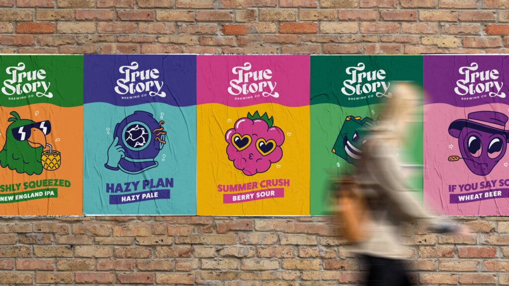 Deuce Studio was asked to come up with a brand identity and packaging system which was impactful, immediately recognisable, and had heaps of personality. The core idea was to base every beer on a real story from the founders’ past, each one featuring a unique illustration on the front of the can, and the story itself printed on the back. This also opened up the opportunity for True Story drinkers to interact with the brand by sharing their own stories.