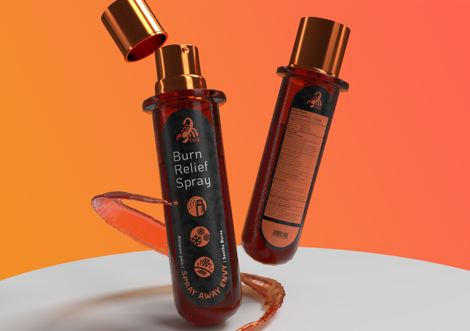 This logo is represented by a scorpion. The term “burning jealousy” can relate back to scorpions and the painful burning sensation that their venomous sting can cause. Envy Burn Relief Spray works to relieve physical burn pain which reflects the metaphorical burn of jealousy.
