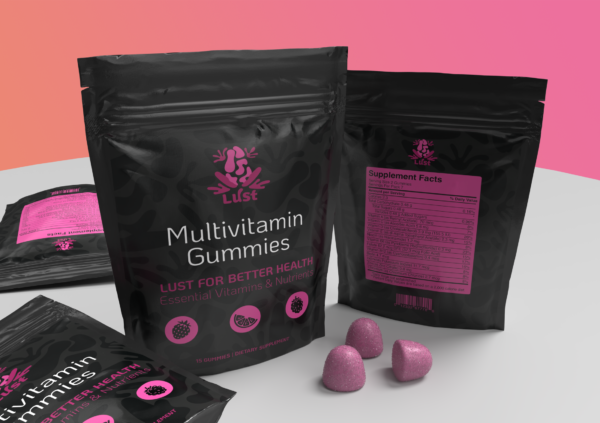 This logo is represented by a poisonous dart frog. Dart frogs are known for their bright vibrant colors and patterns. These colors draw attention and make them very desirable. Lust Multivitamin Gummies are brightly colored and appear very appetizing. This makes them desirable, just like the Dart Frog.