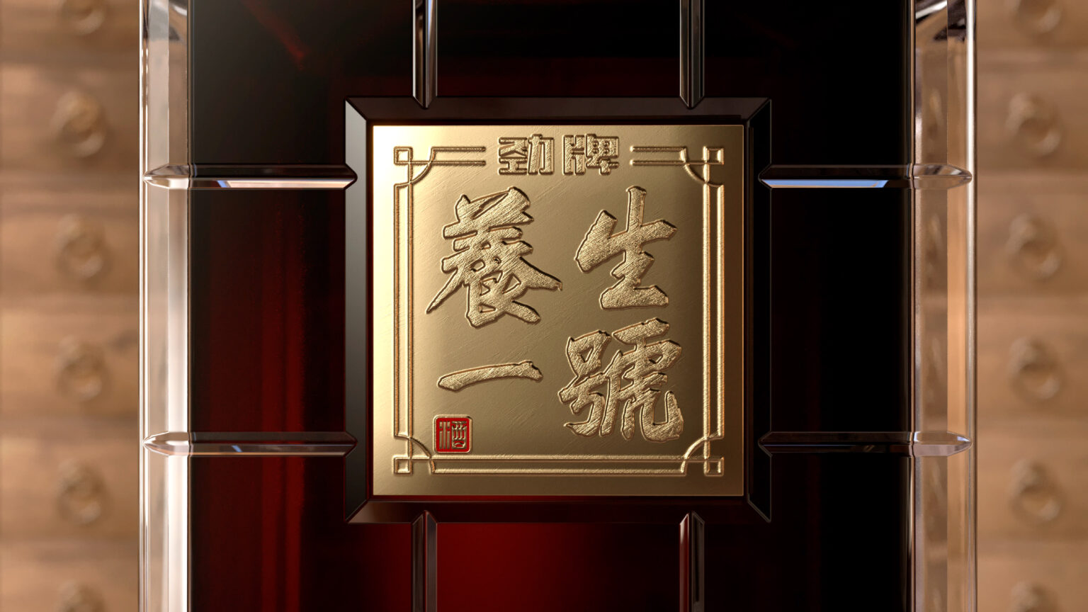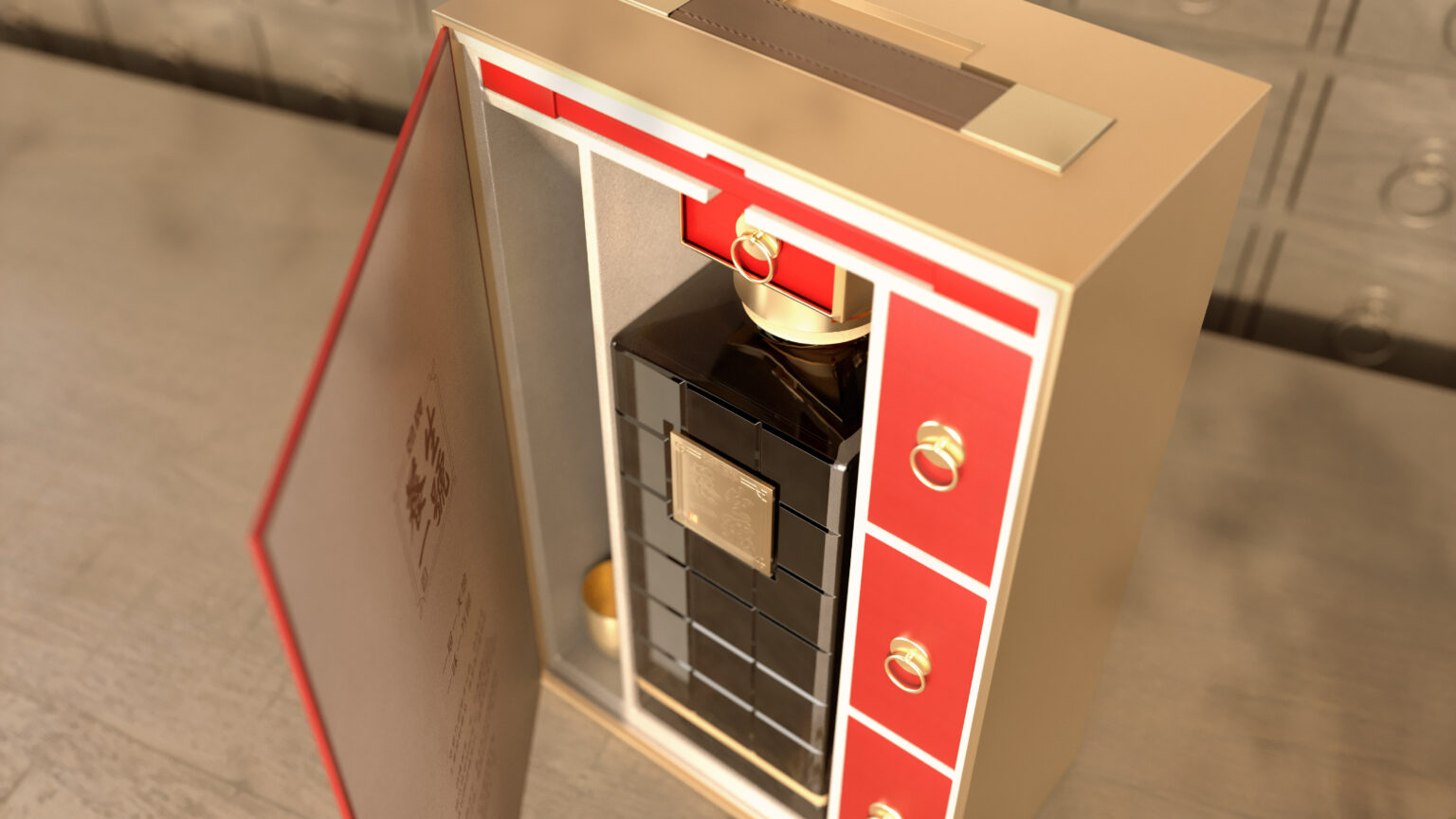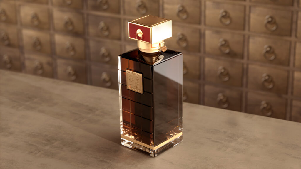 The overarching inspiration for the design was taken from the medicine cabinets used by traditional Chinese medicine masters. This not only serves to amplify the incredible health benefits of Jing Healthcare No.1, but also the meticulousness in the way the precious ingredients are sourced and the Master’s precision in extracting and blending these essences with 15YO Baijiu for an exceptionally refined taste.