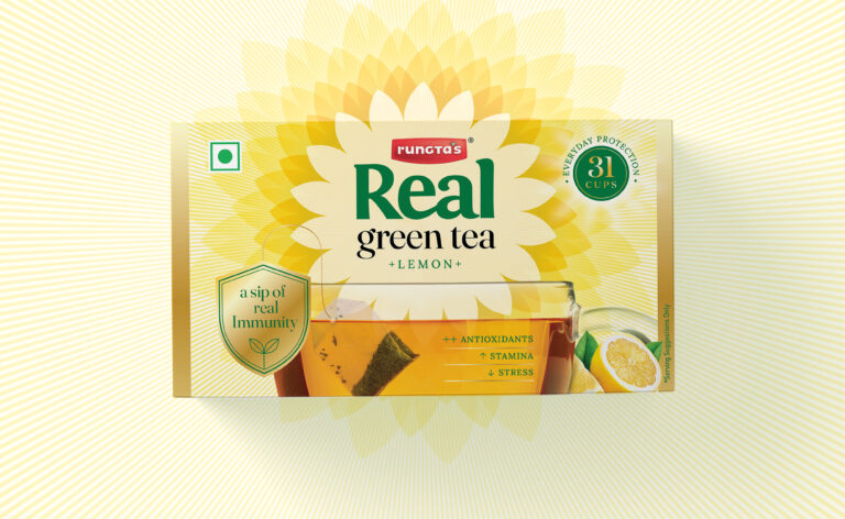 Brand Assets The design rests on the language developed for Rungta’s ‘Real’ range, read it here. The Real ‘garland of leaves’ is floral in shape, the distinct brand asset that underpins the whole design. It encodes virtue, nature, and the morning: subliminally a ritual like a pooja.