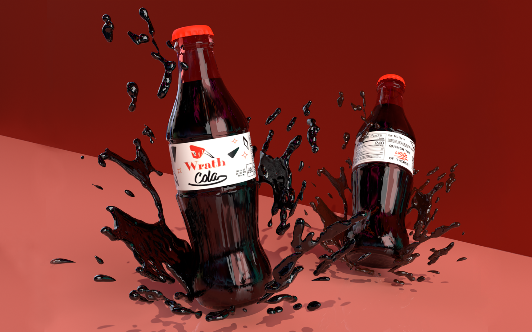 A set of logos were created based around the seven deadly sins. Three of those sins were chosen to be displayed on product packaging. The concept for the logo and continued into the packaging was the persona of the 1950s housewife and how she would be displayed as sins. Wrath was chosen to be a soft drink bottle label, envy was chosen to be sour gummy candy pouch, and pride was chosen to be a milk chocolate candy box. The connection of these products was that these are easily accessible in movie theaters or convenient stores which connected to the housewife always looking for things to be convenient and low effort.