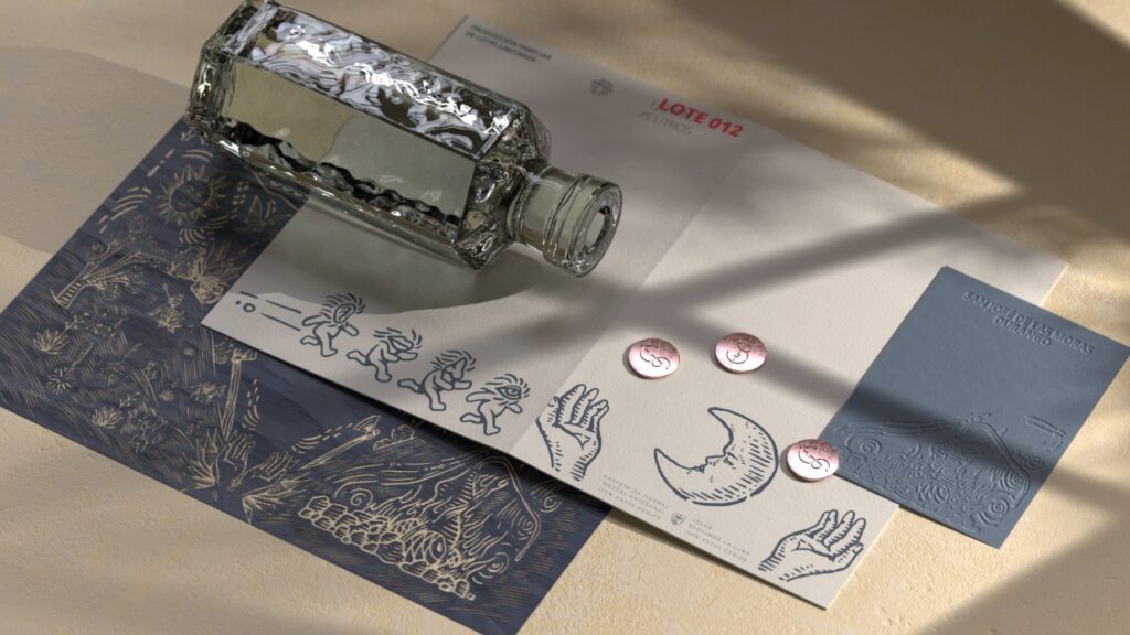 The graphic identity strives to tell the story of the entire process through its label, a label worthy of sharing and interpreting, a reinterpretation of the chopped paper used at mexican folk parties and in offerings, a way of exalting and thanking the land for the mezcal obtained.