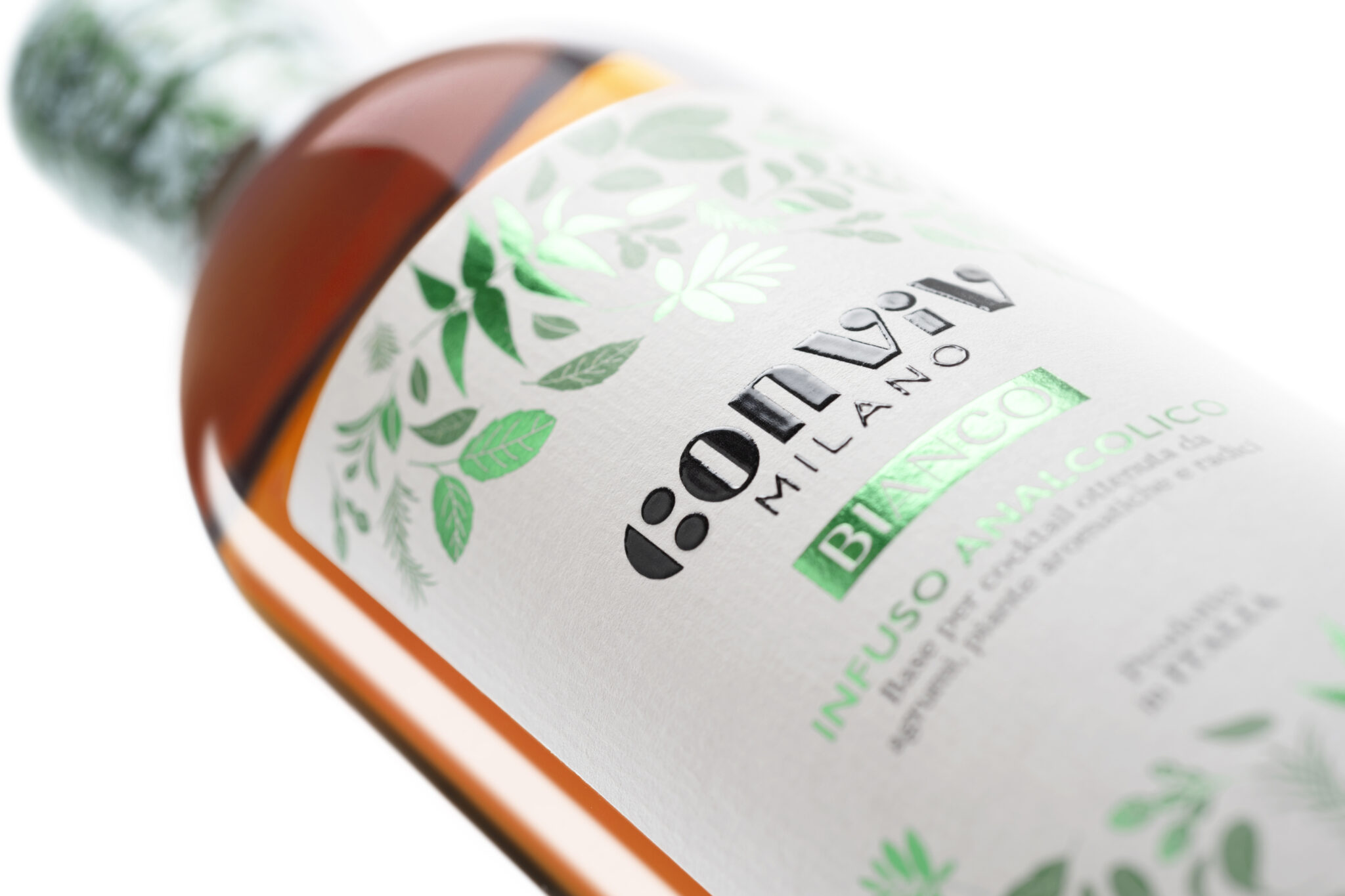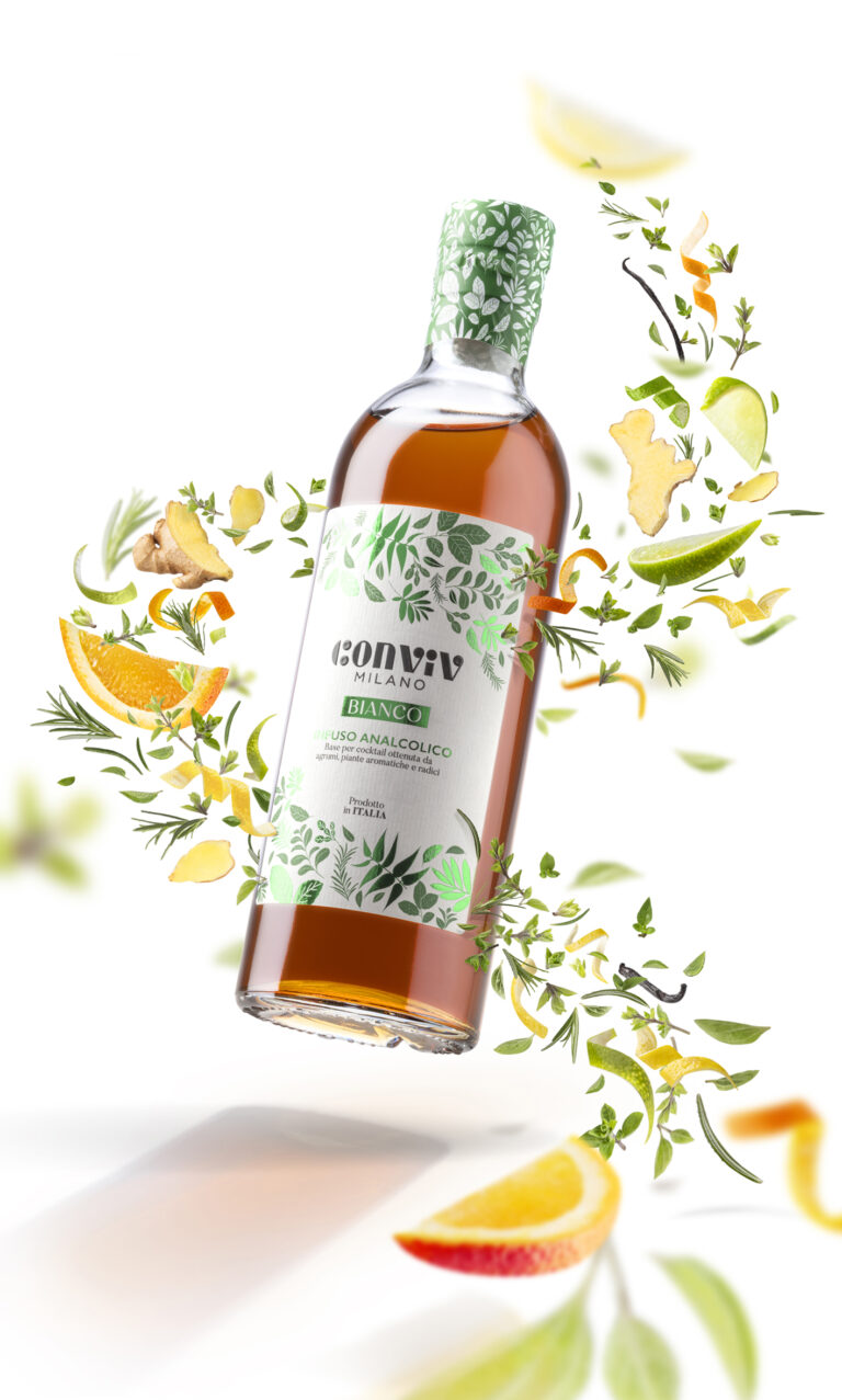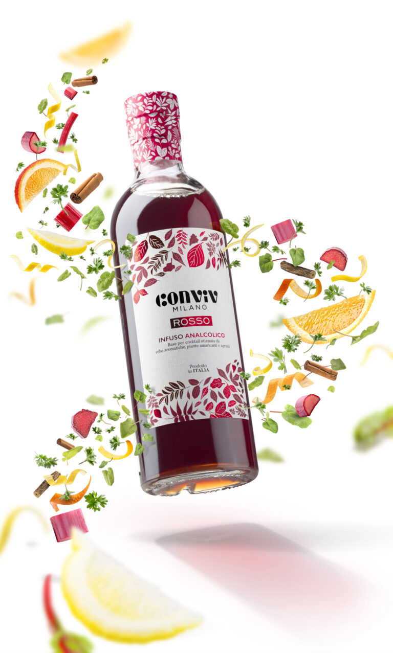 The graphic design has been inspired by Conviv’s exclusive recipe: two natural infusions formulated as non-alcoholic groundworks to offer a variant of choice worthy of the best spirits. It introduces a new kind of conviviality one attentive to people well-being, (few calories, only natural elements made in Italy) and without giving up the finess of its flavor (artfully blended, processing of raw materials by hand, 30 days infusion).