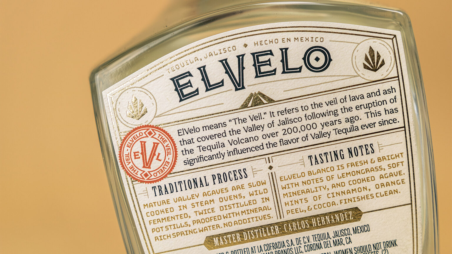 The details are what make stories come alive. These packages show a hand-drawn illustration of the Volcan de Tequila, a foiled emblem at the top of each label, and an engraved stamp on the bar top reinforces the brand with a central monogram, surrounded by descriptive text reminding the viewer of the meaning behind the name. Contrasting light and dark color schemes were used on the labels and closure to showcase the differences in the two expressions, from the lighter Blanco to the barrel-aged, darker Reposado. In every detail, from the package to a cocktail tasting, the incredible history of the Tequila Valley is told, experienced, and commemorated with ElVelo.
