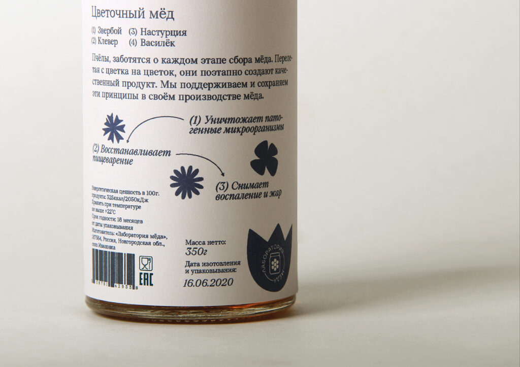 The packaging design for honey which emphasizes its main characteristics: production focus and health benefits.