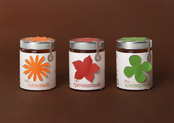 The line differs in the color and shape of the flower from which honey is made, and the reverse side describes the process of its creation. Flower petals are trimmed to be an important part of the honey packaging trend – transparent elements that allow customers to see the natural color and texture of the honey in the jar.