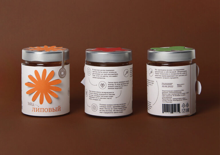 As materials, I chose a glass jar with a metal lid, which allows you to conveniently store and use honey at home, use the container after using the product, or hand it over for processing. The label and the opening control are made of paper, which emphasizes the naturalness and warmth of the product.