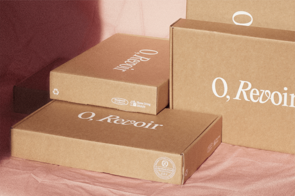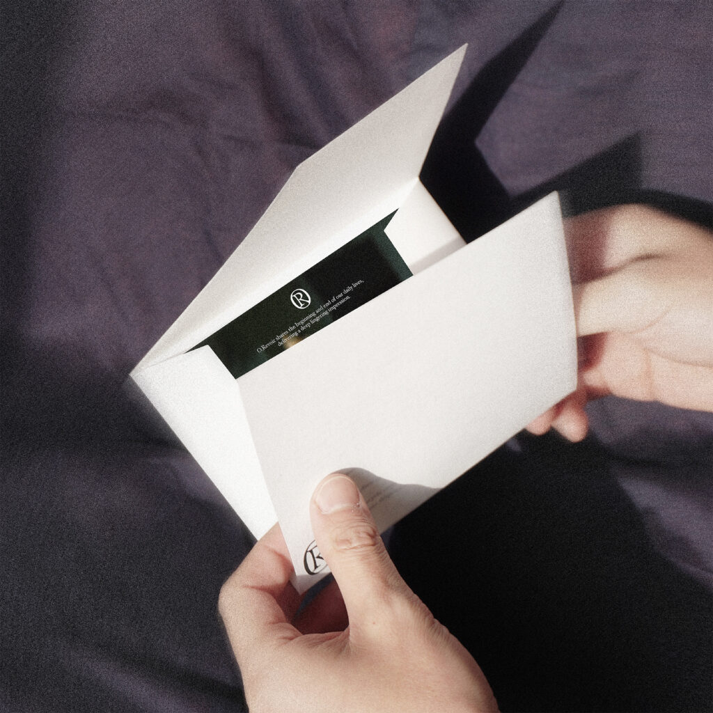 Hour Minute Seconds designed O,Revoir’s business cards and shipping/return guides, as well as labels and box packages used in bedding.