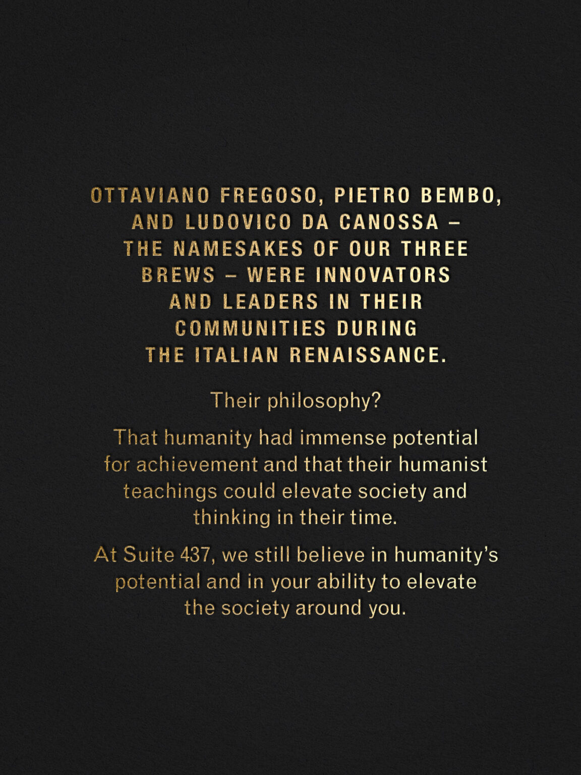 Suite 437 is a premium subscription coffee company for the ambitious. The brand concept originated in the intense and direct confidence of Italian fashion brands, and their signature theme: sprezzatura.