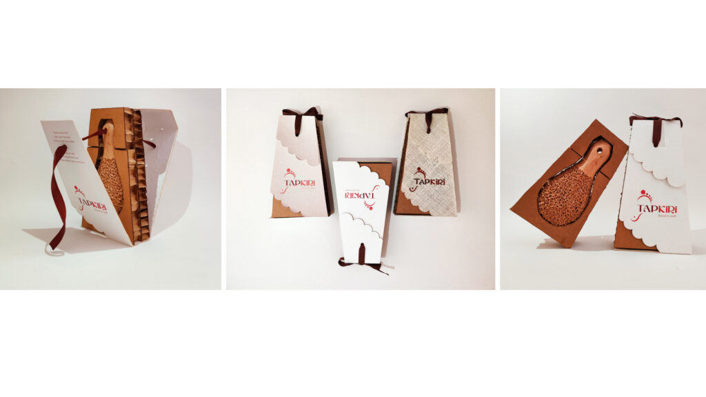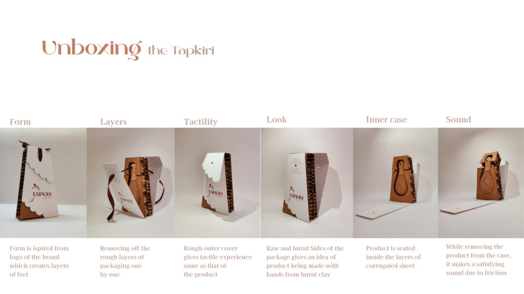The form is inspired by the logo of the brand which creates layers of feet, a rough outer cover that gives a tactile experience same as that of the product,  raw and burnt sides of the package give an idea of the product being made with hands from burnt clay.