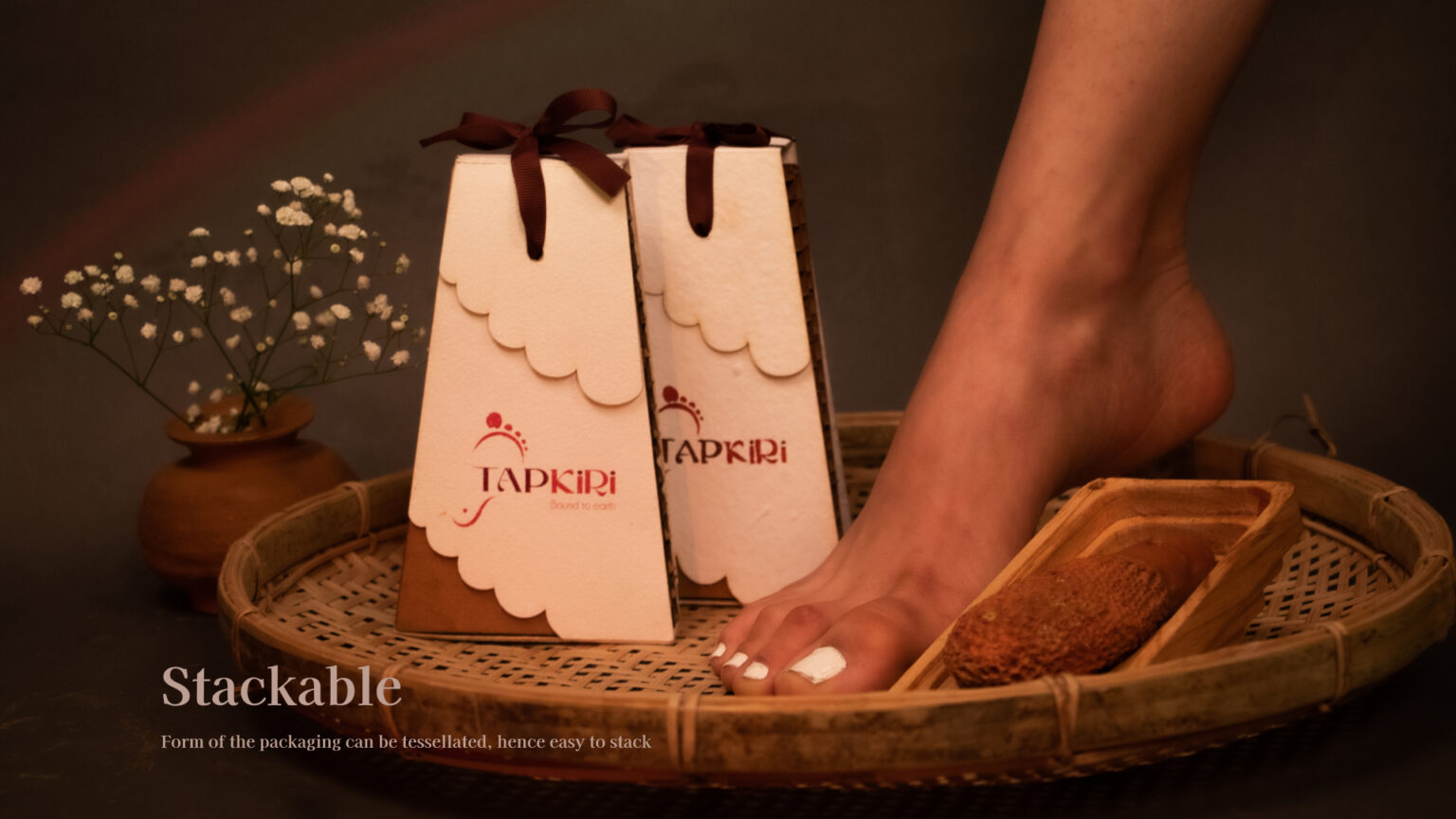 It is handmade with terracotta (burnt clay) and then a rough texture is achieved on the surface by putting it into a mould. This craft and product are poorly documented and there is a lack of optimal packaging for the terracotta foot scrubber. Currently, terracotta foot scrubbers are sold in the newspapers.