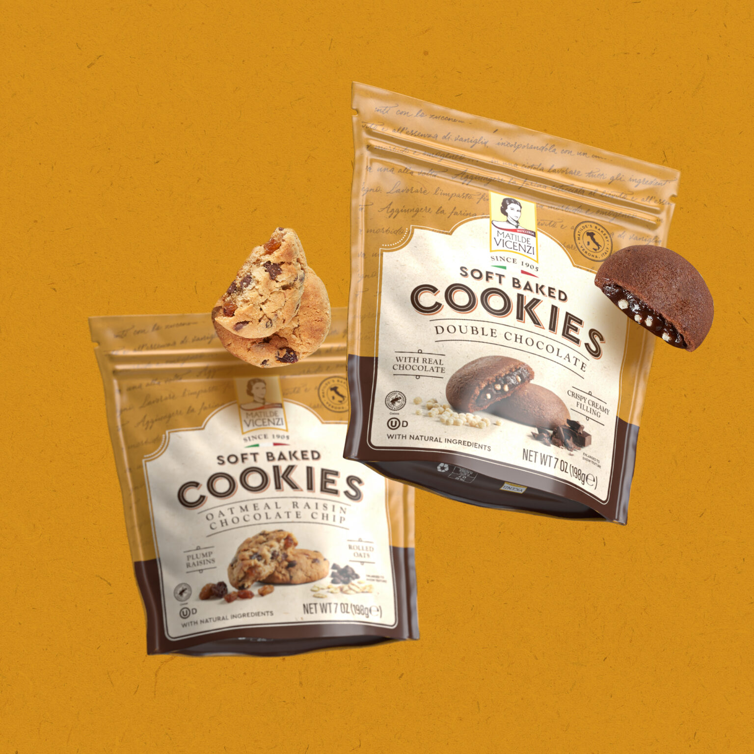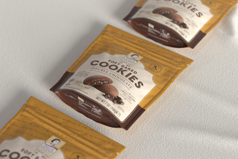 Vicenzi commissioned QNY Creative to redesign the packaging for the U.S. market while keeping the brand’s characteristic artisanal component. The packaging’s background is an ode to Matilde Vicenzi’s old recipe book, in the form of a handwritten letter. The center and bottom of the new packaging represent two distinctive elements: The soft-baked cookies are made with natural ingredients and real chocolate and possess a crispy creamy filling – hence, showcased right at the center of the package. The authentic flavor, on the other hand, is represented by the bottom section, in which the color can change depending on the flavor, from brown to other colors, such as lemon or raspberry, giving room to a future line expansion.
