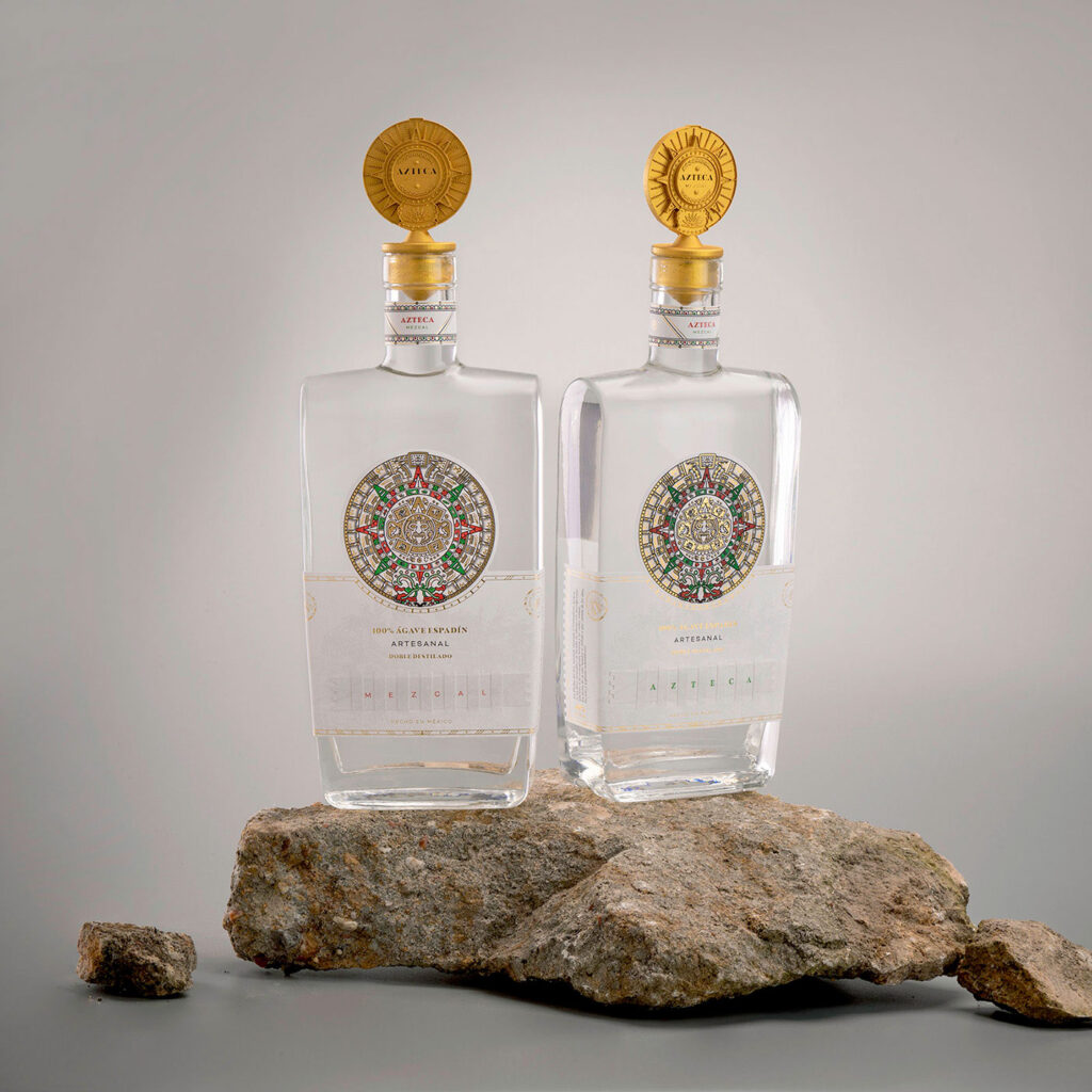 The complex label is made up of a calendar that has 3 different papers printed with the colors of the Mexican flag to reinforce the origin of this product and gold stamping. In the lower part, through a “pop up” system, you can change and thus see the name and the product as you move it. In the background is printed an engraving of the sacrifices that were made on this stone.