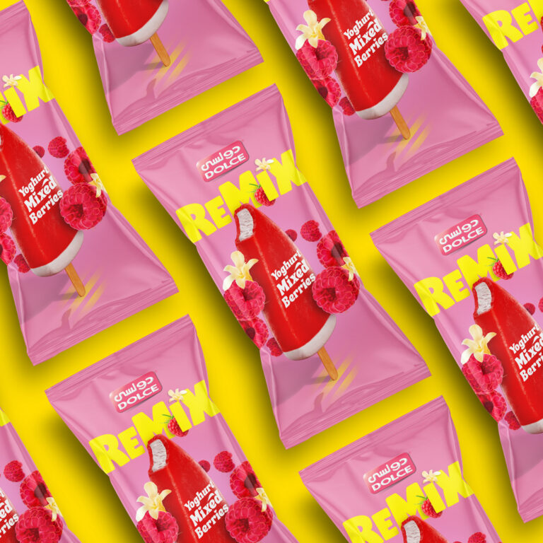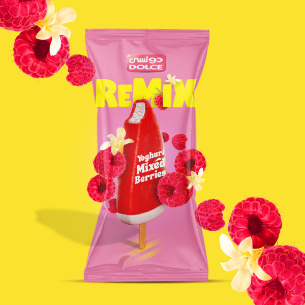 Dolce Remix is the perfect blend of refreshing fruity flavors and satisfying creamy textures. Its outer shell is a sweet mixed-berries popsicle, and its filling is a smooth vanilla yogurt ice cream. When we weren’t busy devouring one Dolce Remix after another, we worked on the product logo and packaging design.