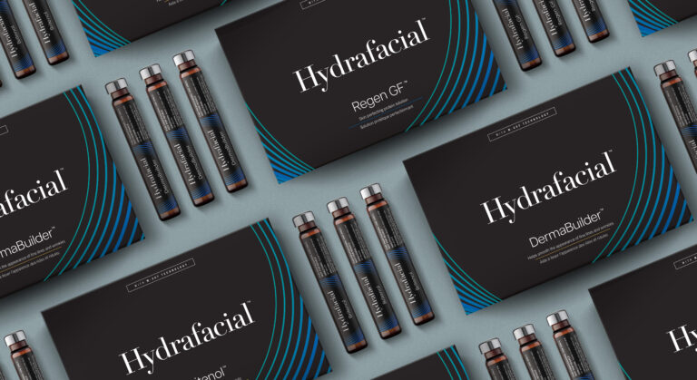 Hydrafacial’s logotype was elevated by tweaking the positioning of the water droplet found in the upside down “i” of the original, to slip it into the curvature of the “f’ in the new logotype. The design team also introduced a hero visual – the pulsating droplet – that descends in a cascade of blue hues to bring depth to each brand touchpoint; from packaging to Hydrafacial’s immersive brand experiences and events.