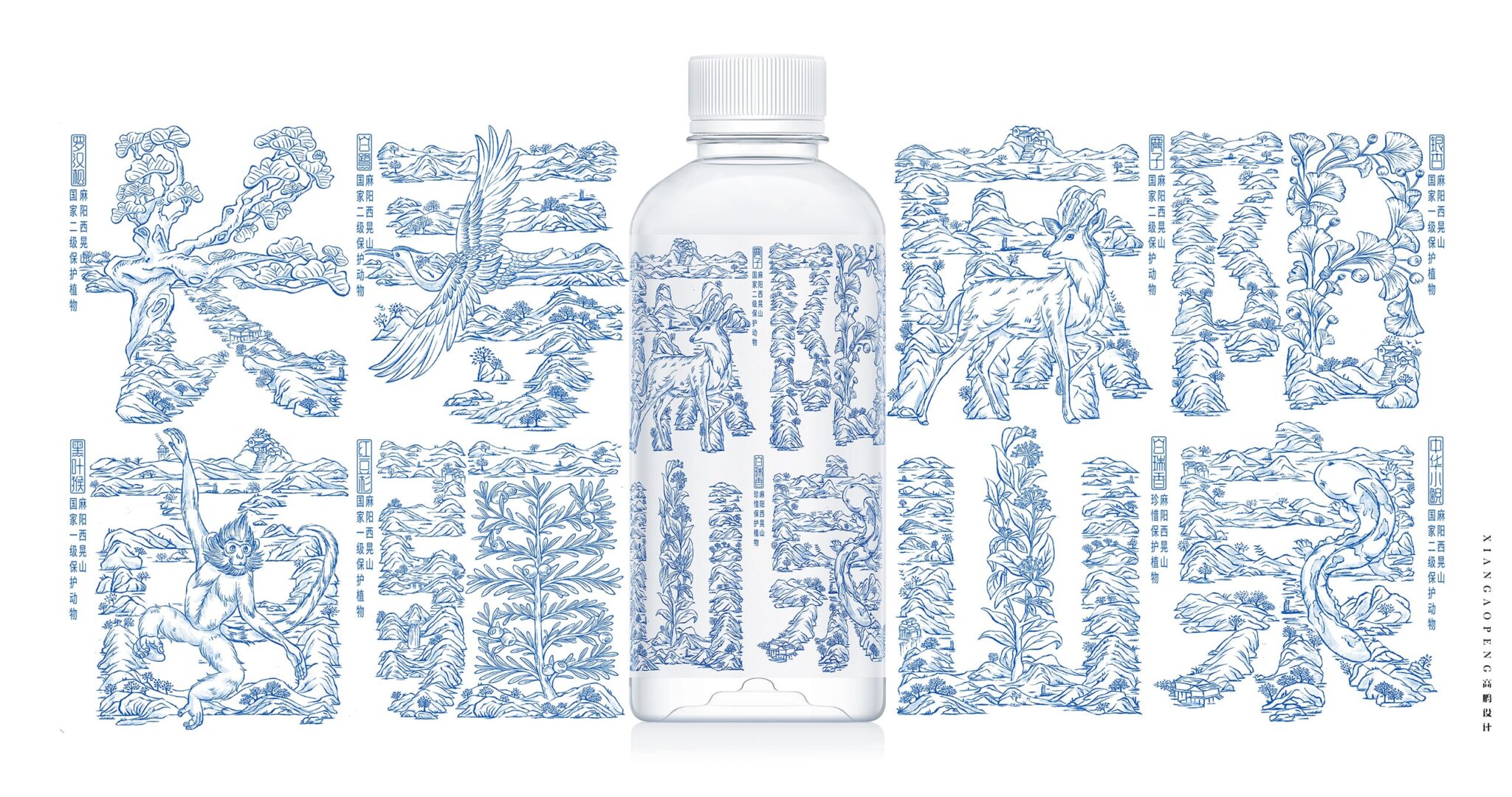 Longevity Miaojiang Mayang Spring The source of this drinking water is located in Xihuang Mountain, Mayang, Miaojiang, Xiangxi. Among them, Mayang is a rare hometown of longevity in China. The area and its surroundings are surrounded by a number of national and provincial nature reserves. Based on the actual situation of the project and changes in the consumer market, We combine the brand’s core concepts and selling points as: Longevity Miaojiang, Mayang Mountain Spring, In the form of advertising language as the main visual symbol and system extension, And incorporate relevant animal and plant and text information into it, Create its unique visual system, Help brand communication and series product sales.