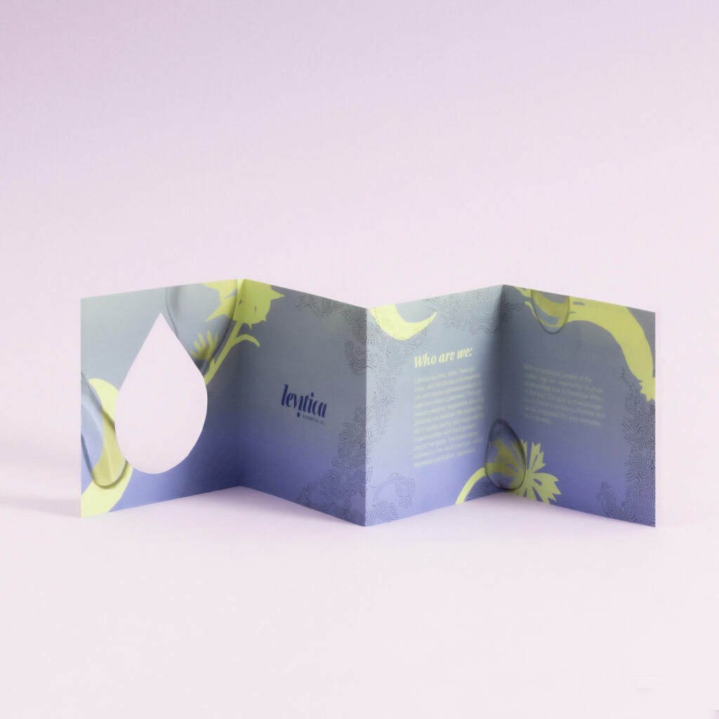 The graphic runs along the entire box, across the edges of the fold. I highlighted the curve of the sides with a blue gradient. All three symbols which are an important part of the image have been represented on the box. In cases of plant representations the yellow illustrations can be related to the material world, the drops represent the essential oil extract of the plant while the rasters symbolize the gaseous substance produced during evaporation.