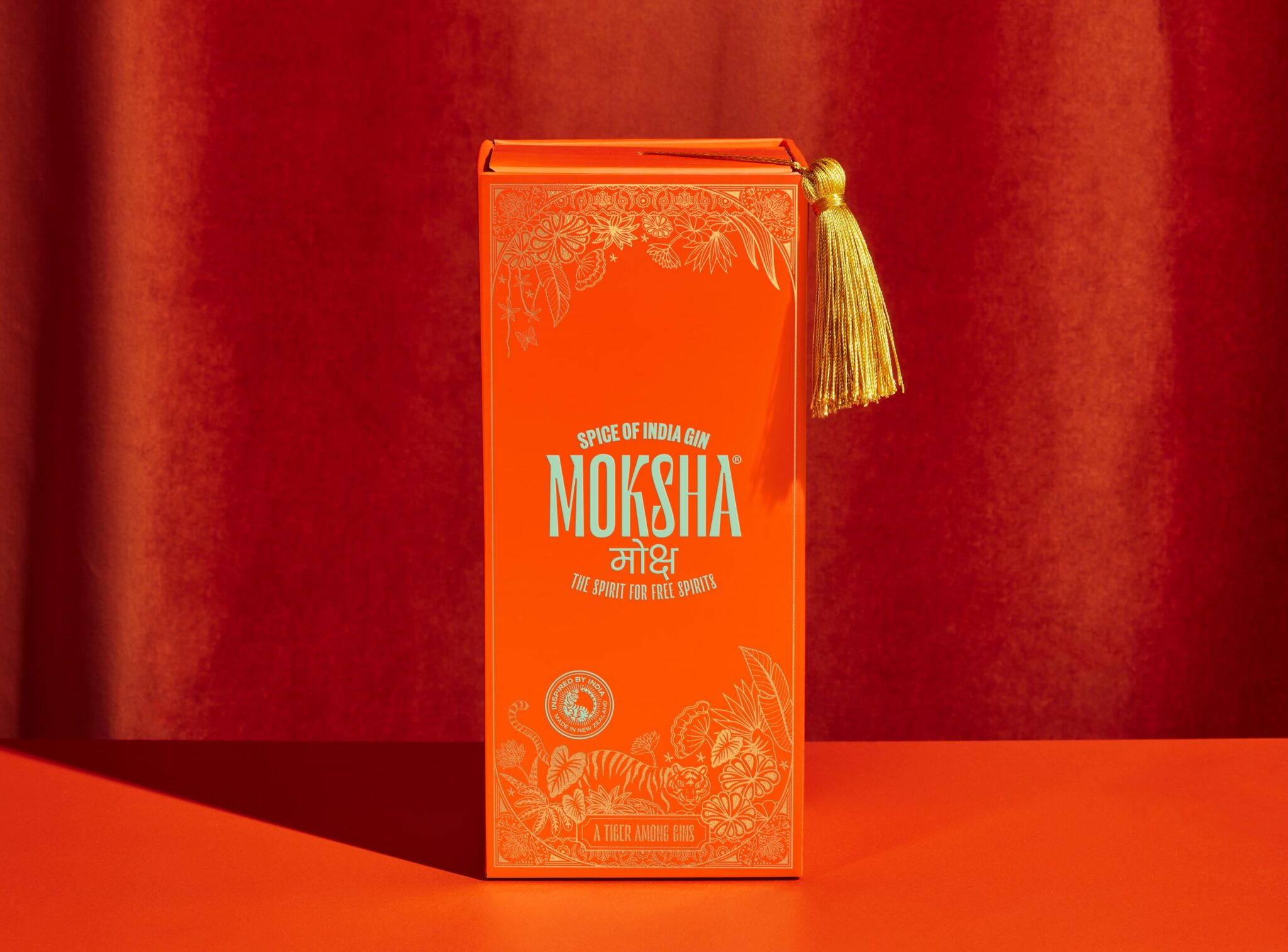 A newcomer to the New Zealand beverage market, Moksha’s nostalgic iconography and rich colour palette is designed to be bold, and this Porter-produced gift box helps to set the tone. Luring the receiver into their Moksha moment with delicate gold foil logos and illustrative detailing, the limited edition box is topped with a custom gold tassel drawer pull for good measure.
