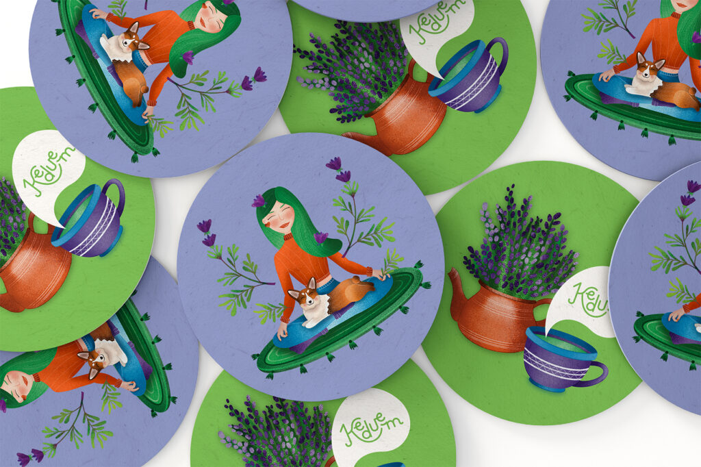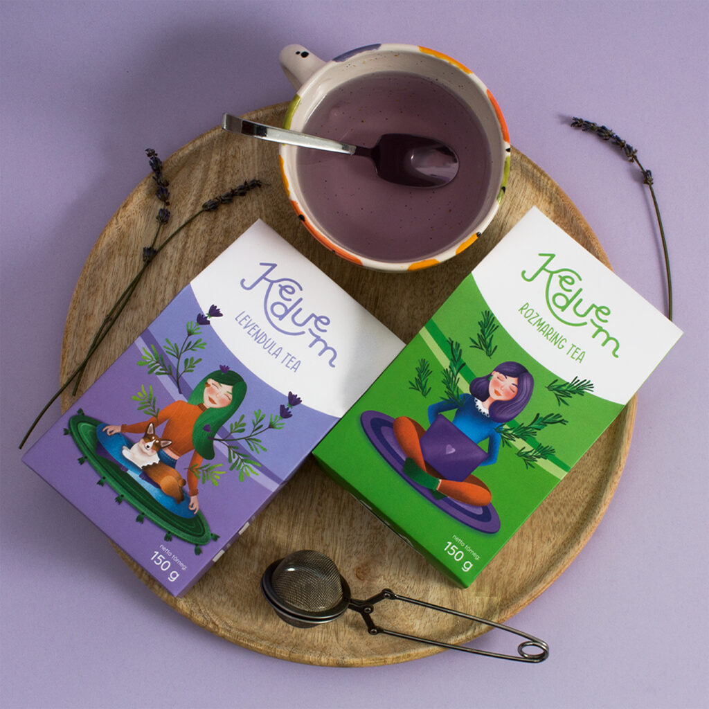 Both packaging features the purple and green-haired girl who also appear in other parts of the brand design. The waves in the background represent the mood swings. The lavender girl is calm, relaxed and meditative, while the rosemary girl is active. The herbs also appear in the illustrations.