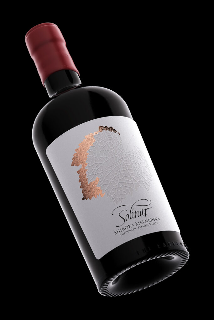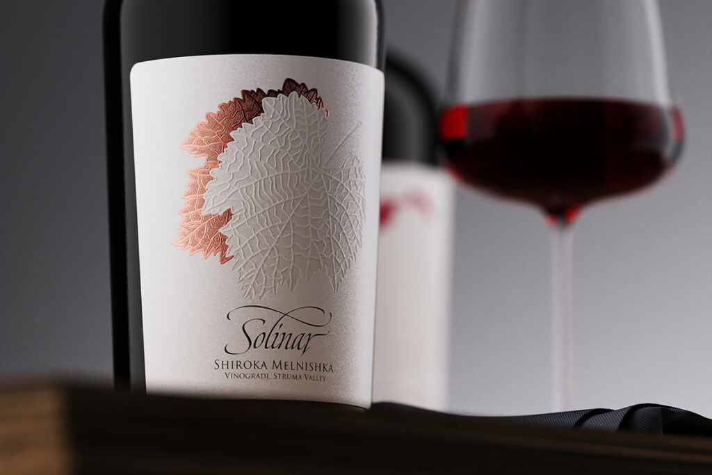 The label has a classic shape with rounded corners. The main element is a vine leaf from Shiroka Melnishka Loza – perhaps the most famous local variety for Struma Valley. The vine leaf is a very common motif in wine label designs, so I somehow wanted to show it in a different and even unconventional way, using the printing superpowers of my friends at Dagaprint. Together we chose a very special thicker paper on which we stamped the leaf, creating quite a serious debossing effect. Every single leaf detail was made to stand out as much as possible after debossing. At the same time, I made a fragment of another leaf, which was behind the first and stamped it with copper or red hot foil. I made a special micro-texture that showed the details in the leaf in a very interesting and elegant way. At the bottom of the label, I left some space for the Solinar brand and varieties.