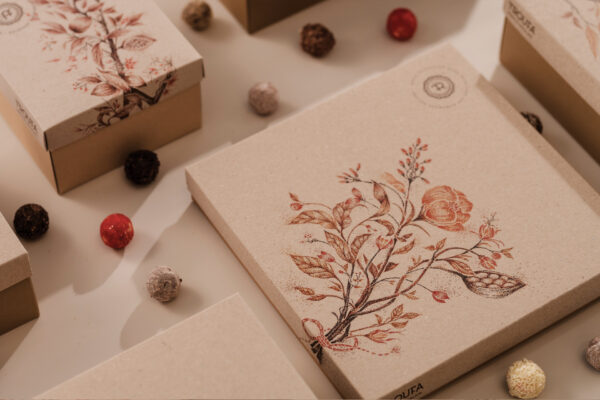 For this reason, we created custom designs drawn by hand using the “stippling” method with pens, which were digitally processed, and directly printed on the boxes. Botanical designs, cocoa branches and intense minimal typography around the logo adorn the store’s new boxes.
