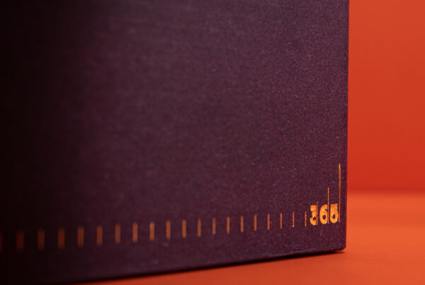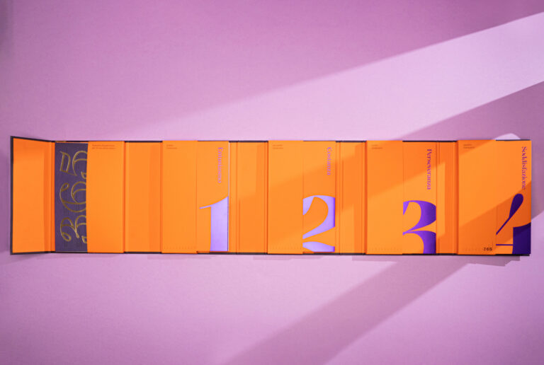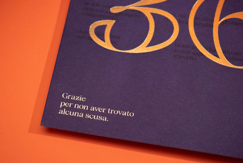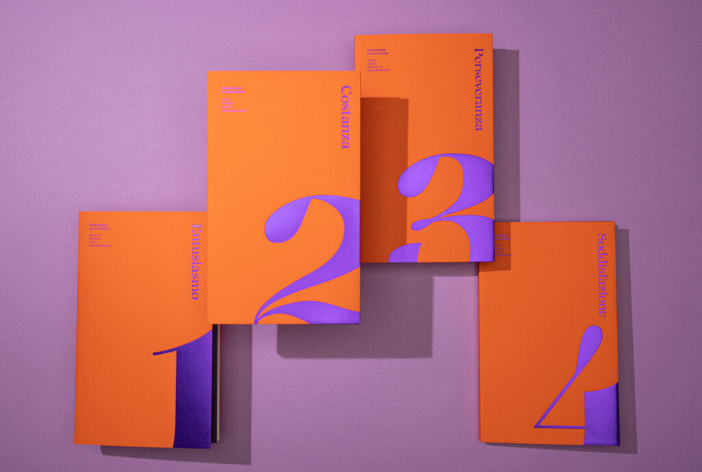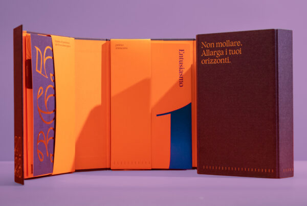 The box is made of cardboard covered externally with Fedrigoni Savile Row Tweed Aubergine, an elegant paper with a special texture that gives more value to the packaging. The interior is covered with Fedrigoni Sirio Color Arancio, creating a bright effect when the packaging is opened. The 4 agendas also have a cover in Fedrigoni Sirio Color Arancio to blend well with the interior. On the covers, we have planned a hot stamping with purple foil.