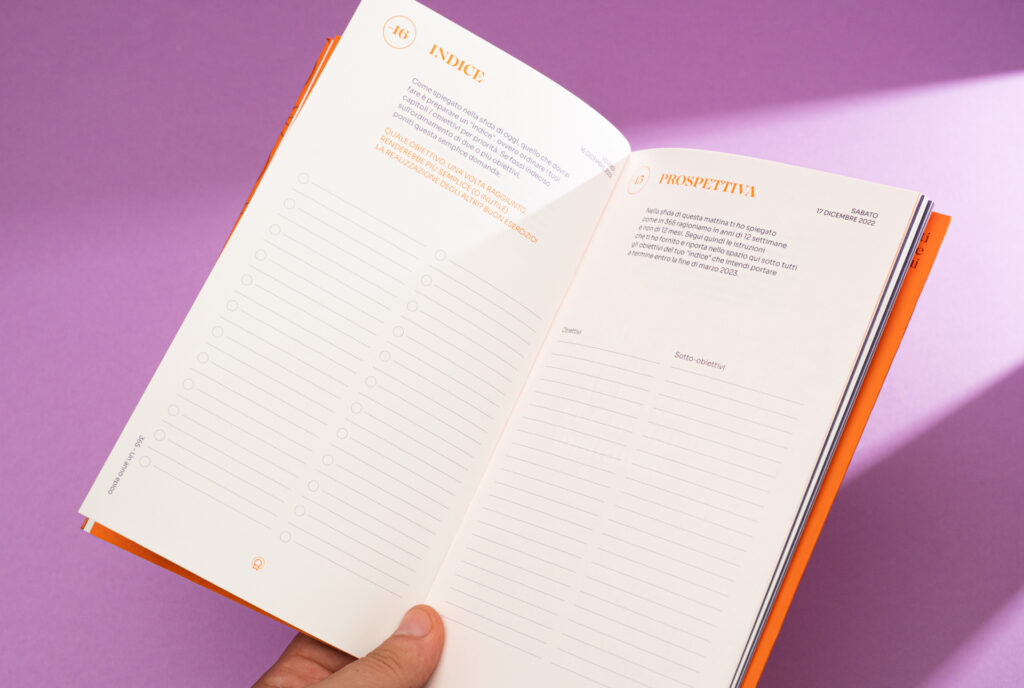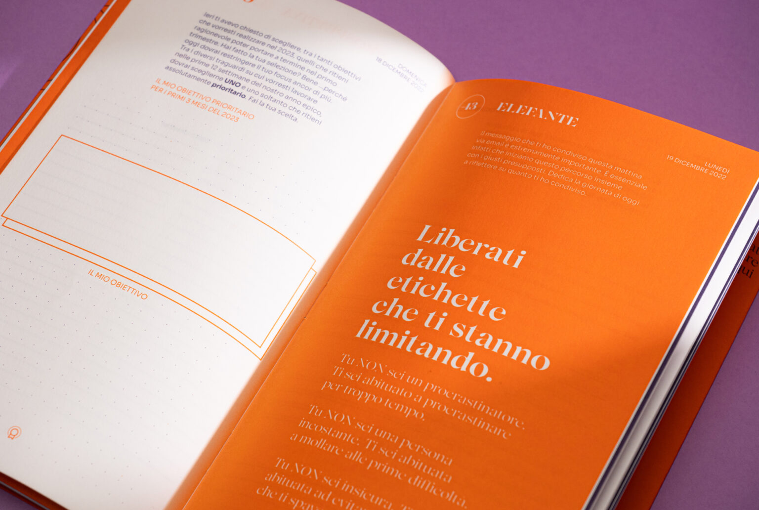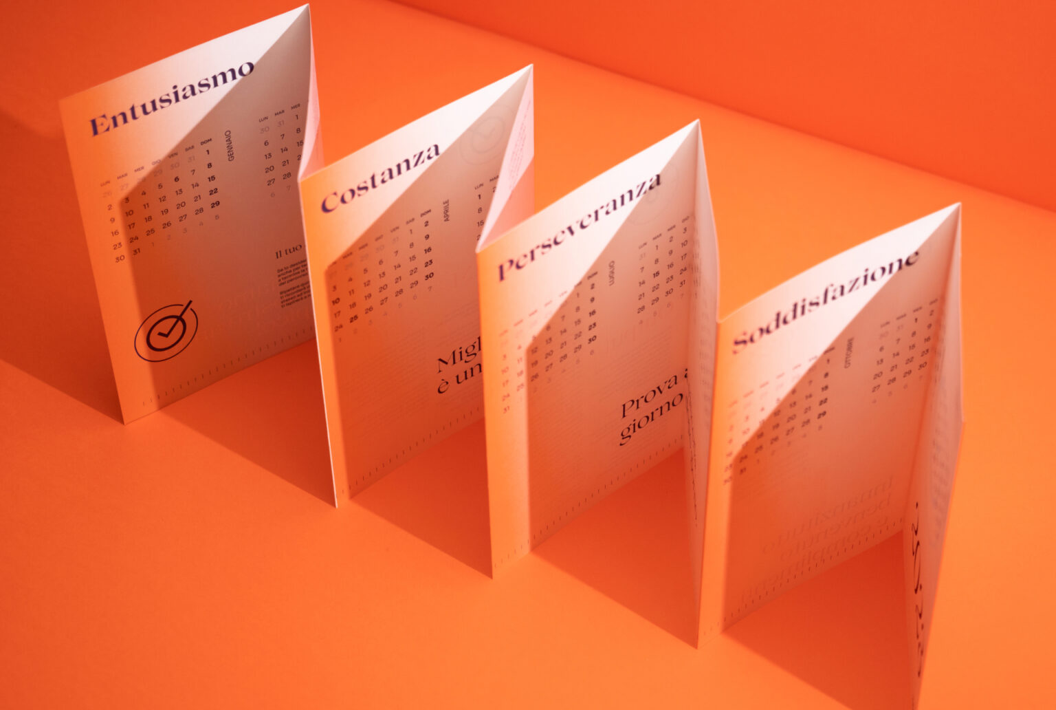 365 is an annual limited edition program reserved for a selected group of readers. It is a project by EfficaceMente, created by Andrea Giuliodori. The purpose of the kit is to help users achieve their goals through daily challenges. For this third edition, we have developed a binder that, when opened horizontally, can reveal the 4 agendas one at a time, in chronological order.