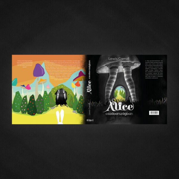 I reimagined the cover of Alice’s adventures in wonderland. My medium of choice was digital art, on the front cover I used a tool that resembles pencil. I stuck to black and white, and mostly used darker colors, this way I could recreate the mystical atmosphere of the place as described in the book. I emphasized this feeling even more with the strong white rim lighting and the squiggly blades of grass. I made wonderland the exact opposite: really vibrant and a little strange. The colorful shapes with sharp edges make this part of the illustration look more abstract and out of this world. The tiny door detail ties together the front and the back of the book cover, we can see what hides on the other side through it. I also designed a unique title text that blends in the details of the illustration on the front.