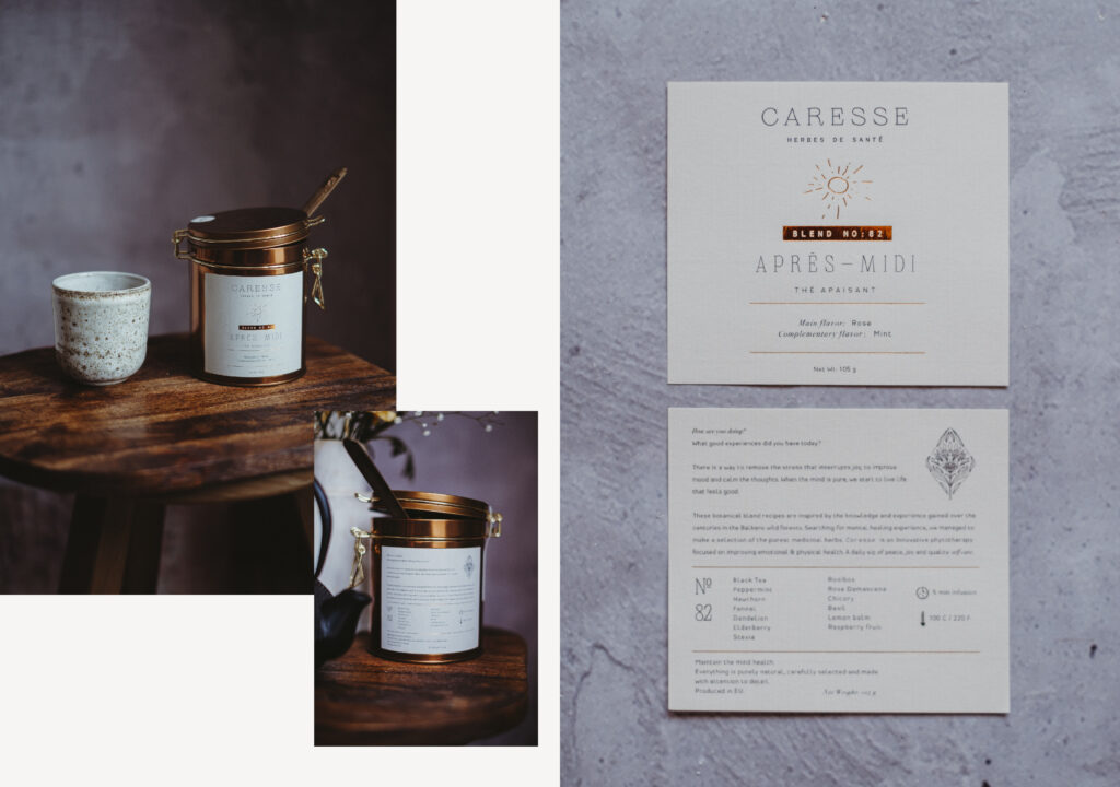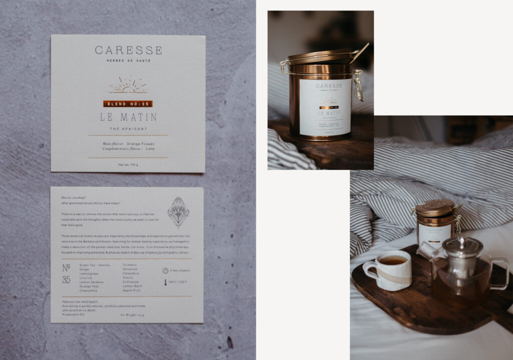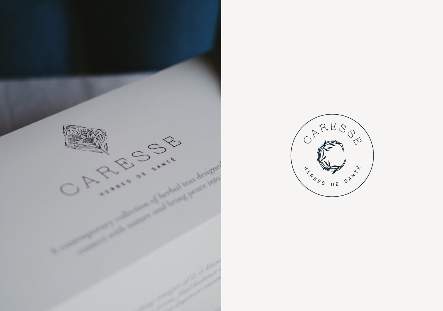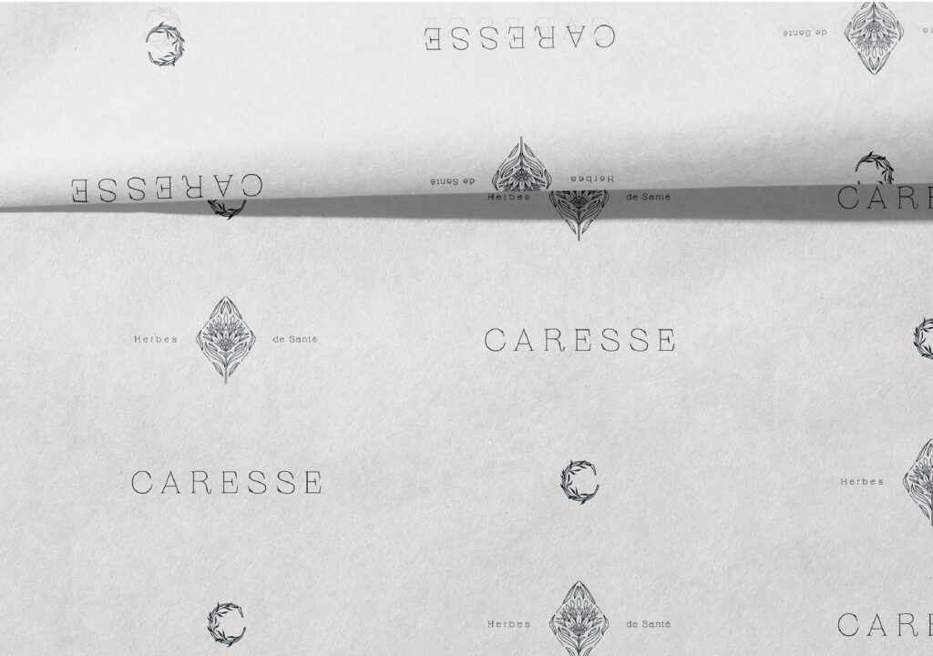 In the branding, we wanted to highlight the research and craftsmanship of the herbs Caresse is working on for her teas, and created an illustration of a mandala-like plant as the brand’s main symbol. Choose elegant and minimal font pairings to give the brand a clean look. Created a unique badge shape that is complementary to the main illustration and a monogram with C letter and intertwined petals to use on small stickers.