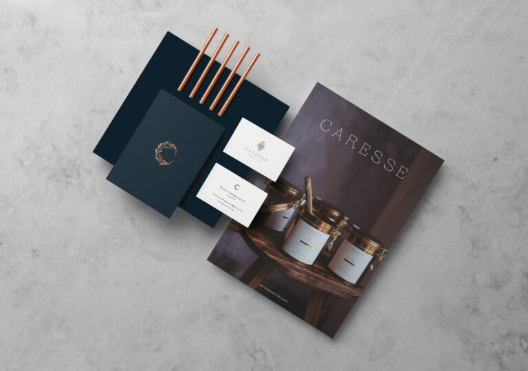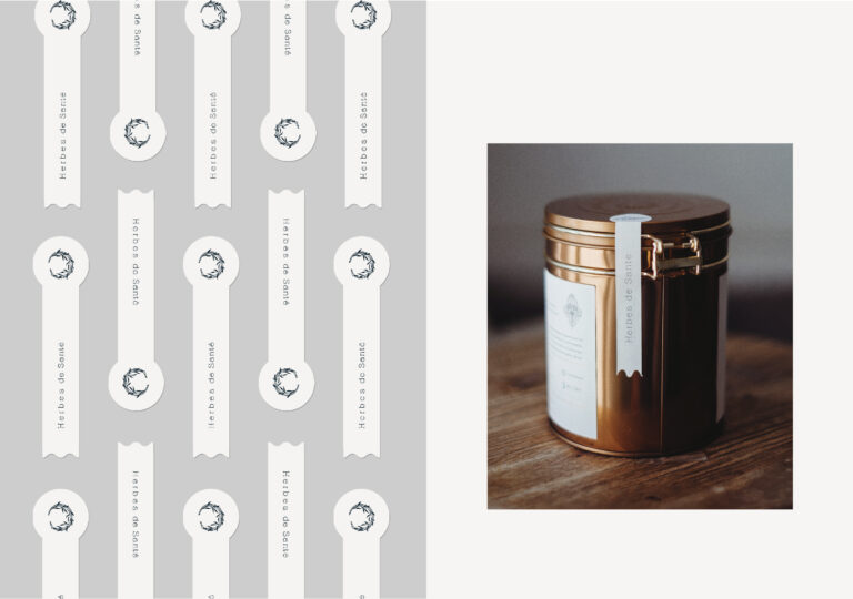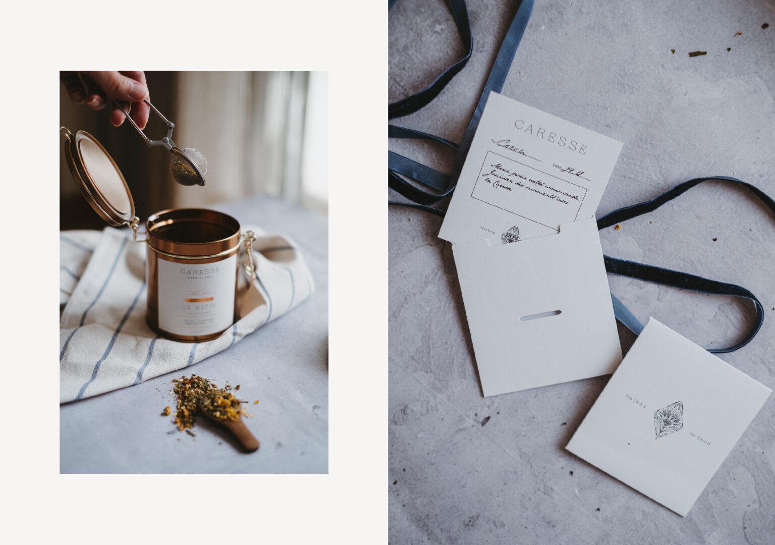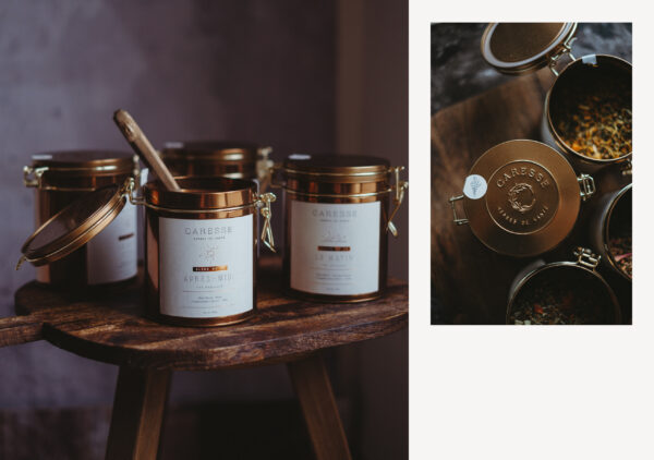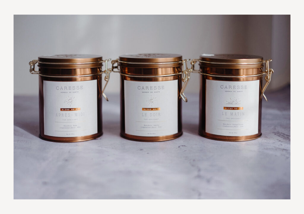In the branding, we wanted to highlight the research and craftsmanship of the herbs Caresse is working on for her teas, and created an illustration of a mandala-like plant as the brand’s main symbol. Choose elegant and minimal font pairings to give the brand a clean look. Created a unique badge shape that is complementary to the main illustration and a monogram with C letter and intertwined petals to use on small stickers.