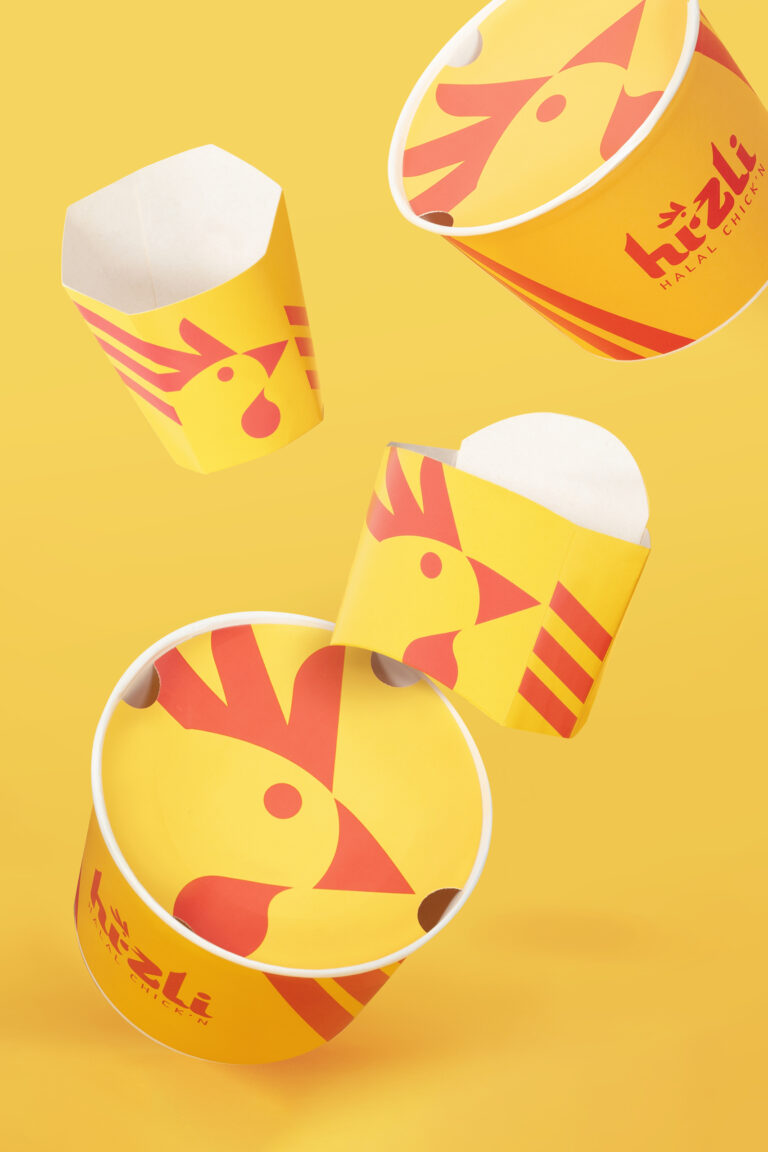 Brand identity creation: It was very important that Hizli Halal Chick’n had that typical ‘happy-go-lucky’-feel that is associated with snacking. At the same time, we also had to be wary that the design did not detract from the brand’s credibility and quality perception. We wanted a chicken to be the hero of the brand and created an iconic, abstract illustration of the chickens’ head. This illustration is a fundamental feature of the brand logo, but can also be used as an isolated element thanks to its high recognizability.