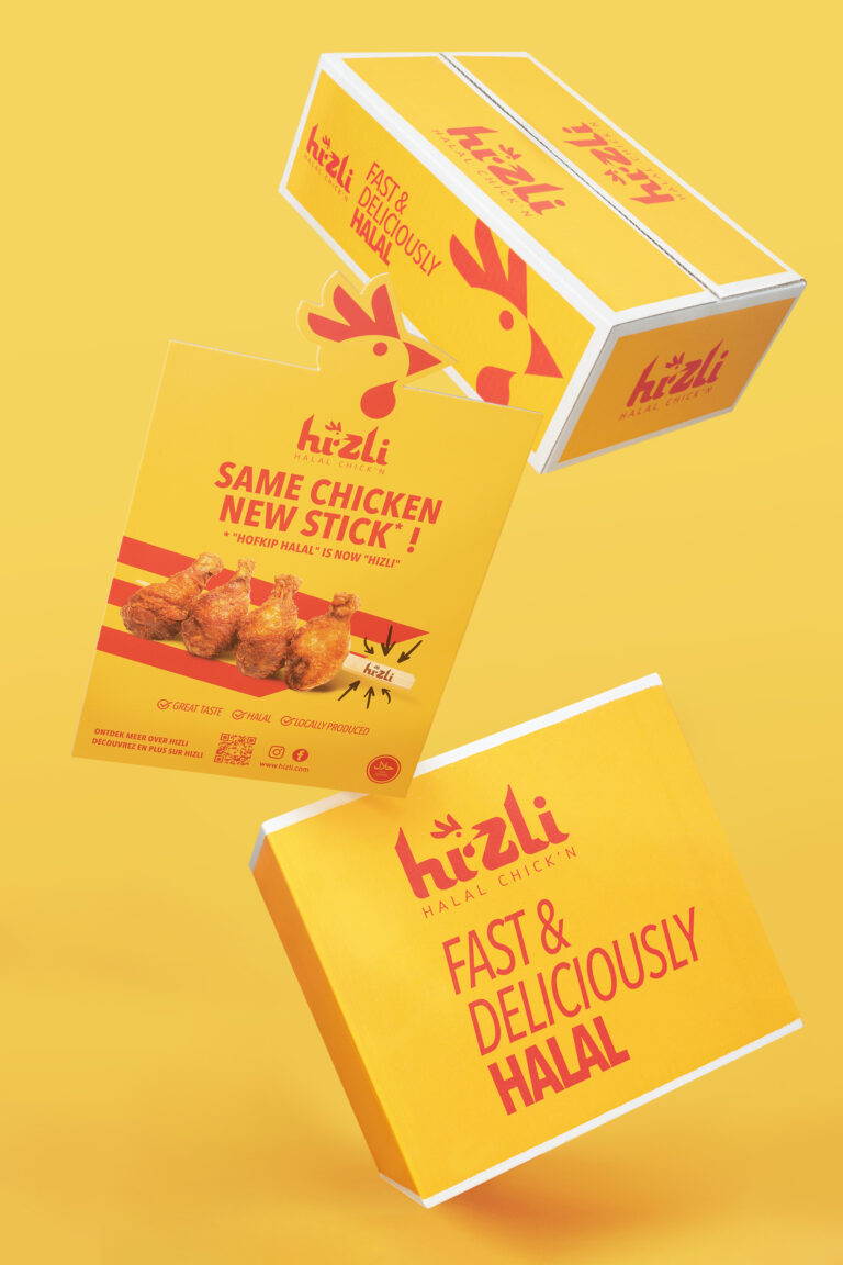 The halal-certified logo appears everywhere in front-view, in a very visible but not dominant position. This is a deliberate choice: the Hizli brand stands for high quality chicken snacks for everyone who is into chicken but it is also vital that halal-consumers feel safe and ensured that what they buy is 100% halal-proof.
