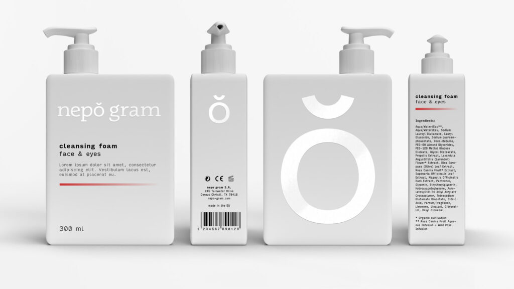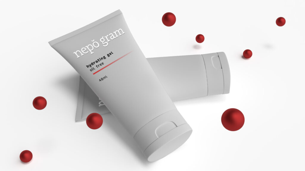 Nepo Gram’s product series required the usage of different packages in different sizes and proportions. Pump bottles, jars, and tubes, all had to strictly comply with the visual identity.