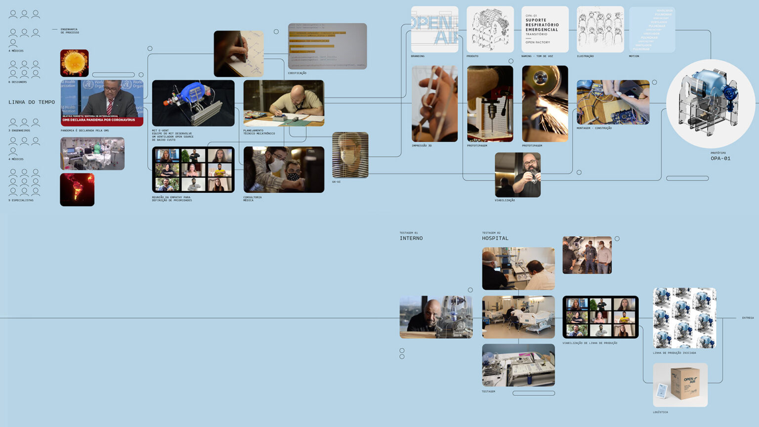 Our main objective was to deliver a lung ventilator that met the minimum requirements of Anvisa and partner hospitals so that it could be used by the greatest possible number of patients. The “Open Air” brand was designed so that the “air” element was in evidence, within the context of mechanical breathing, communicating equipment that responds to serious emergency situations, causing the sensation of movement, mimicking the exchange of air provided by pulmonary ventilation.
