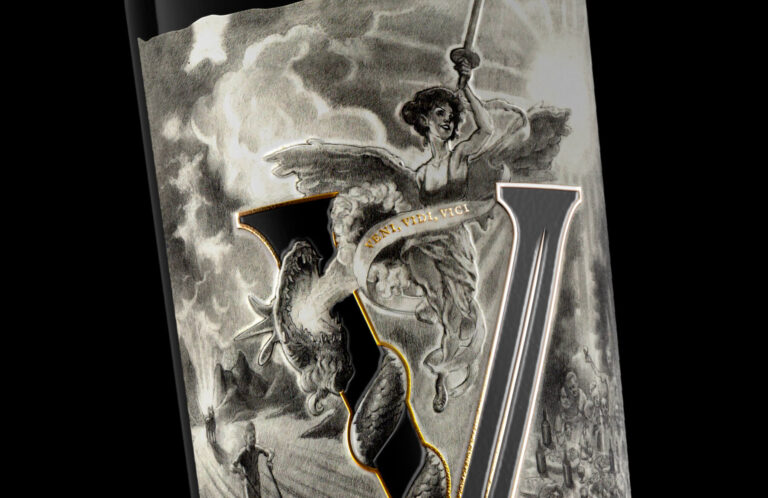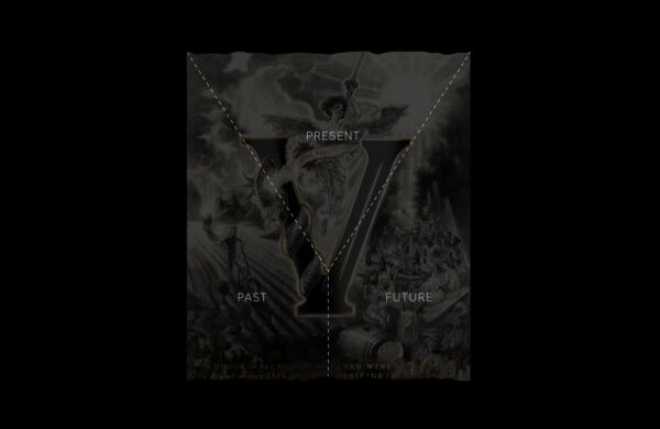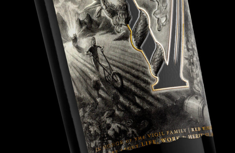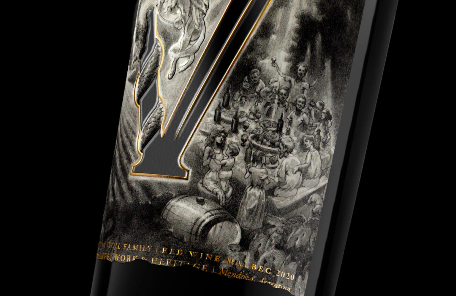 The wine label portrays the different moments in Jeff’s life, from the past to the future. The past is reflected in the image of Jeff working the land, sowing the seeds of his future, accompanied by his animal spirit: a wolf. The present is represented with a winged victory, symbolizing overcoming adversity with the sword held high, facing the dragon of life. And finally, the future is the harvest, the reward of the fruits of labor, represented by the formation of a loving family.