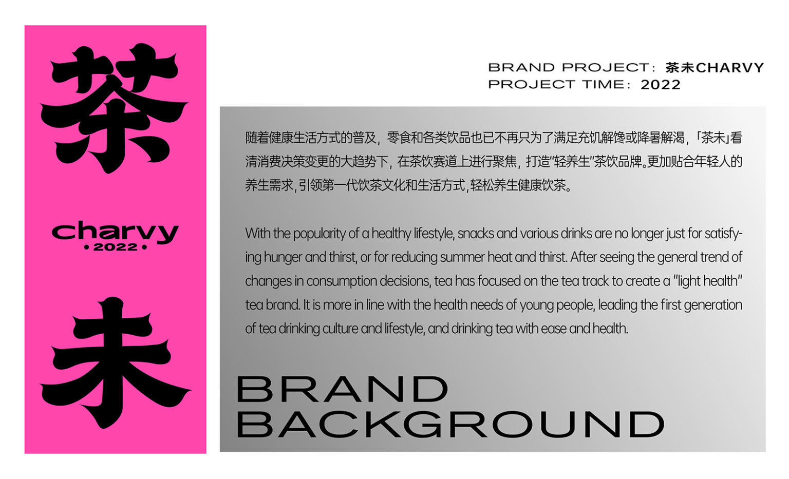 Foreseeing the general trend of consumption decision-making changes, “CHARVY” focuses on the field of tea drinks and creates a “light and healthy” tea drink brand. It is more in line with the health needs of young people, leads the first generation of tea-drinking culture and lifestyle, and aims to make everyone drink tea easily and healthily.