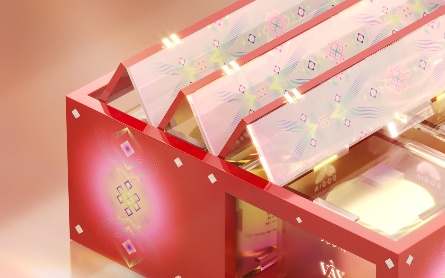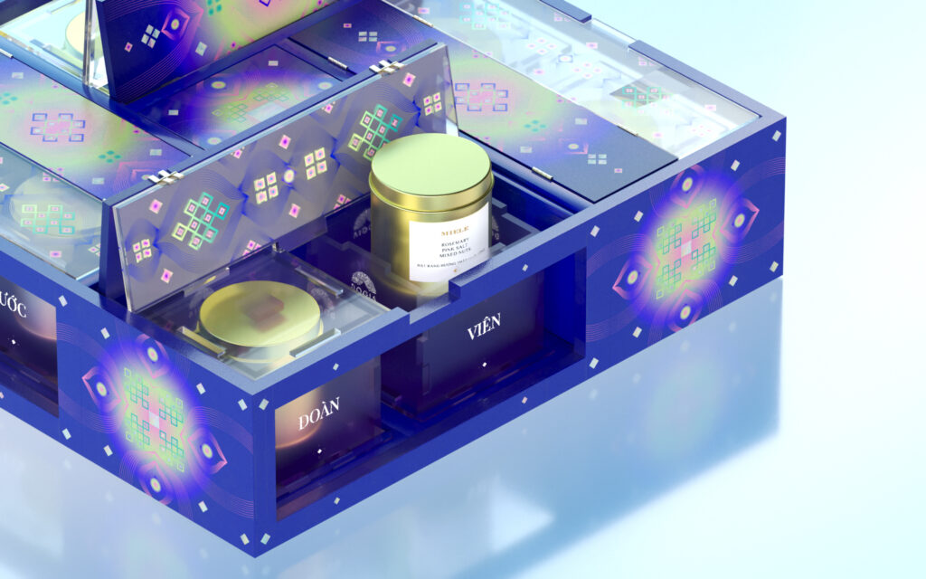 “Dream” in “Reunion dream” is approached by a vibrant palette with smooth and foggy gradient treatment, similar to “spring dream,” and “dream” can be understood as Kanawa Tsugi joint when it comes to structure. This is a wood-joining method based on Yin-Yang space for directly transferring from one wood bar to another without the use of intermediaries. In design, Yin-Yang properties represent condense-hollow details in packaging as well as two materials, lacquer and mica.The cover’s structure is based on the structure of a folding screen – a room divider in Asian culture. Lacquer with traditional values blends with youthful and open-minded mica material in this section. Because of the stark contrast between the two materials, when the pieces are arranged as if opening the box, details on opposing sides will reflect reciprocally and intertwine, implying one’s willingness to open up and share feelings with their partners.