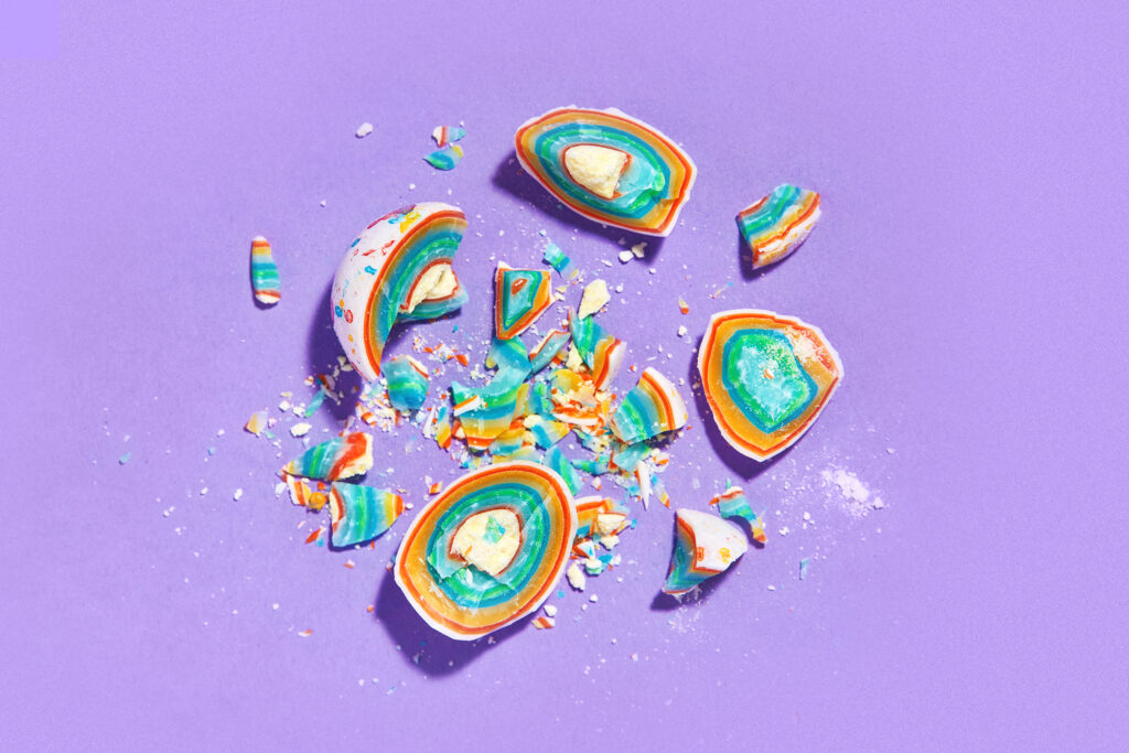 Work on the brand began unconventionally – with a bright design system and packaging design for several items. A massive logo was created, the rounded shapes of which refer to the product, and a corporate style built on a combination of rich, saturated colors. The package design is based on the colorful photos of sweets taken by Fabula Branding’s photographer. And also a knockout window – because such a pretty product is sure to want to show.